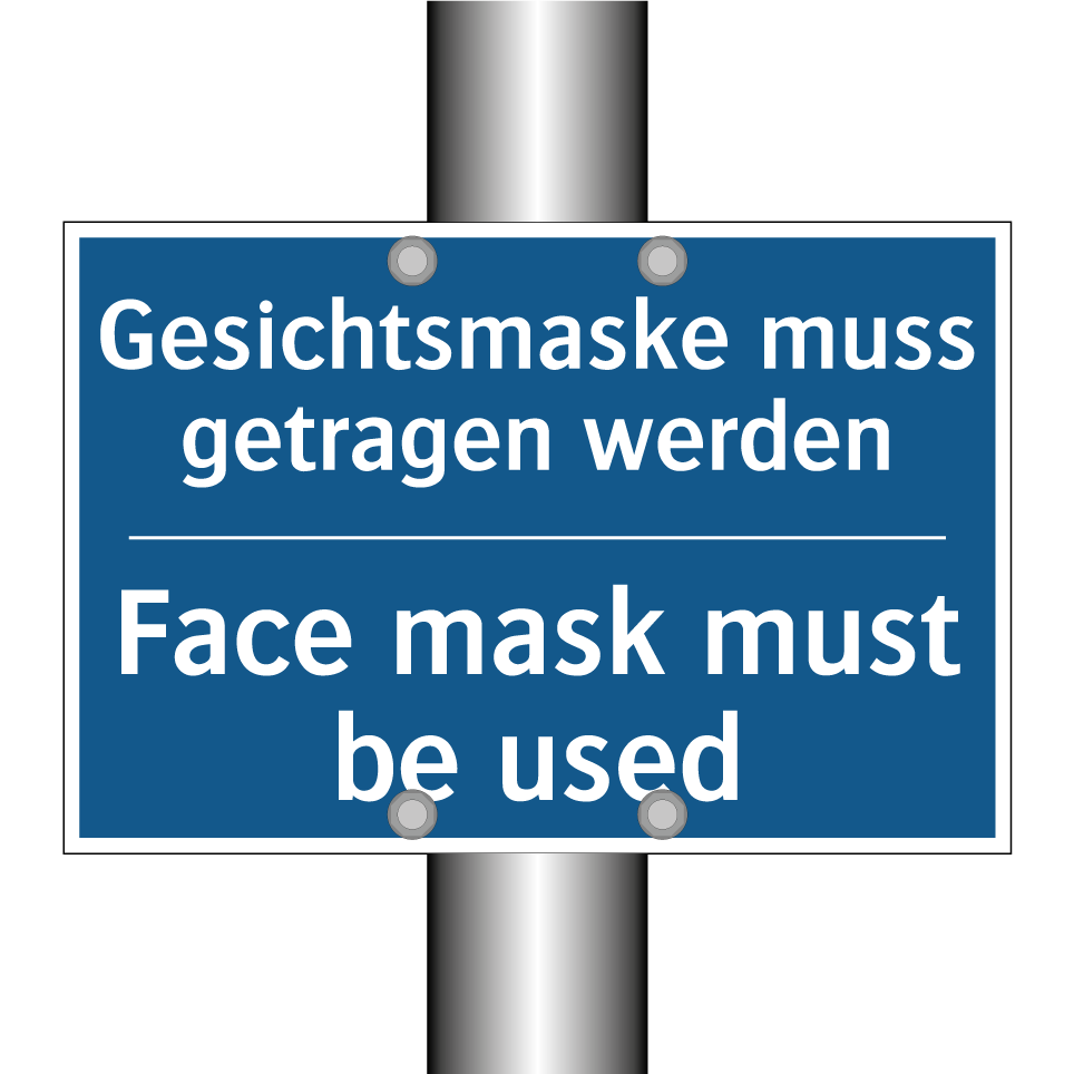 Zweisprachiges Verbotsschild mit deutschem Text Gesichtsmaske muss getragen werden und englischem Text Face mask must be used