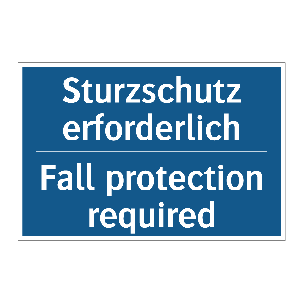 Zweisprachiges Verbotsschild mit deutschem Text Sturzschutz erforderlich und englischem Text Fall protection required