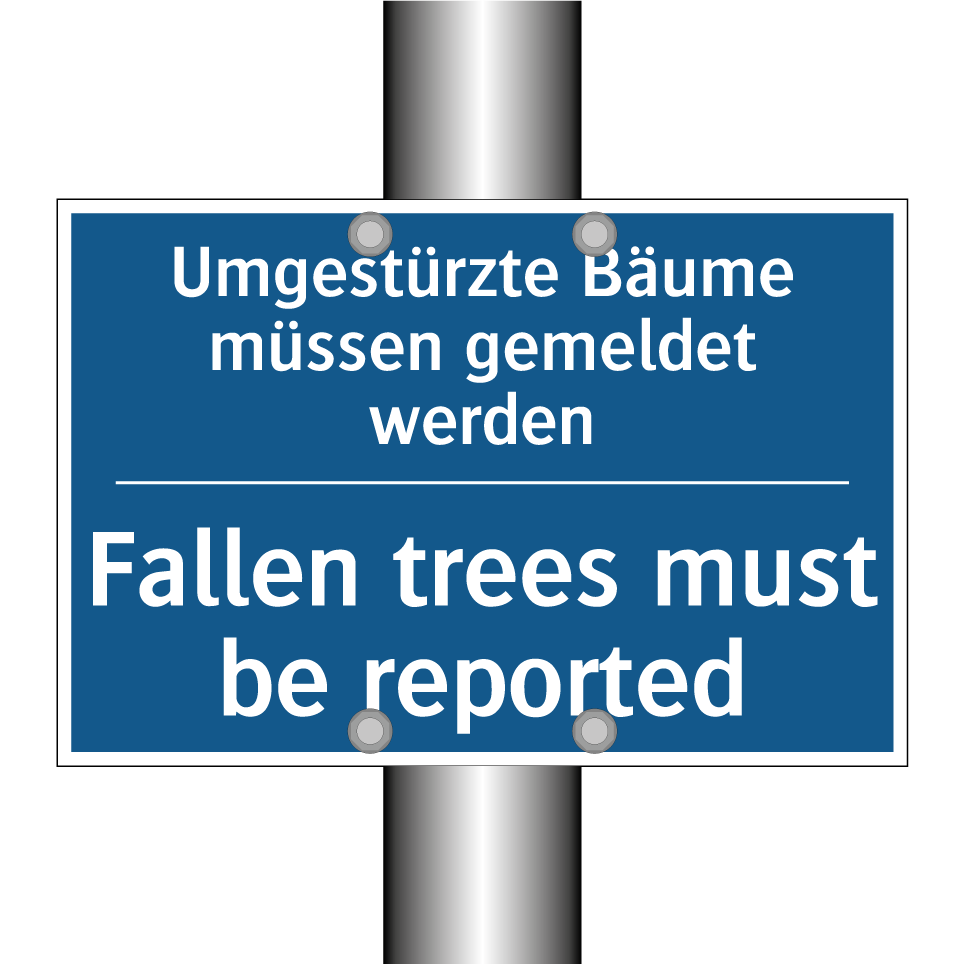 Zweisprachiges Verbotsschild mit deutschem Text Umgestürzte Bäume müssen gemeldet werden und englischem Text Fallen trees must be reported