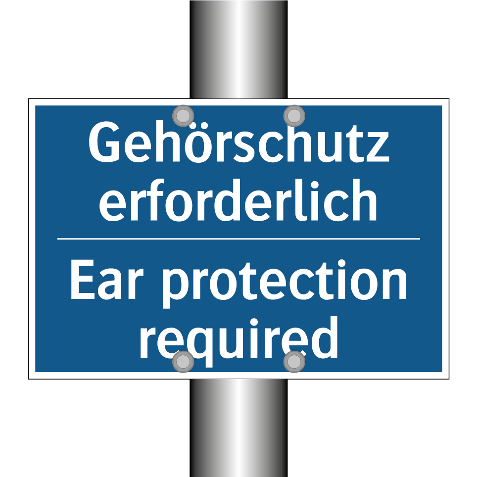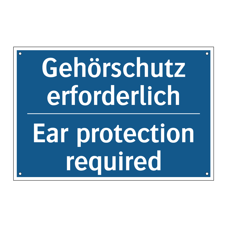 Zweisprachiges Verbotsschild mit deutschem Text Gehörschutz erforderlich und englischem Text Ear protection required