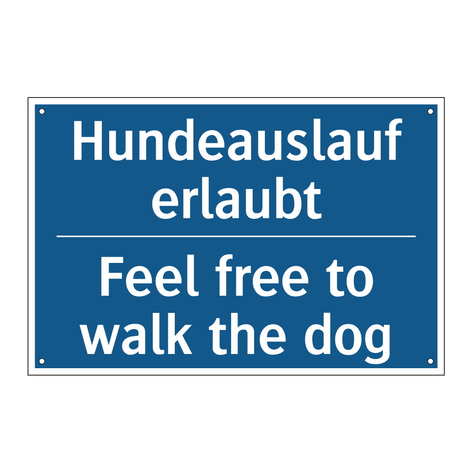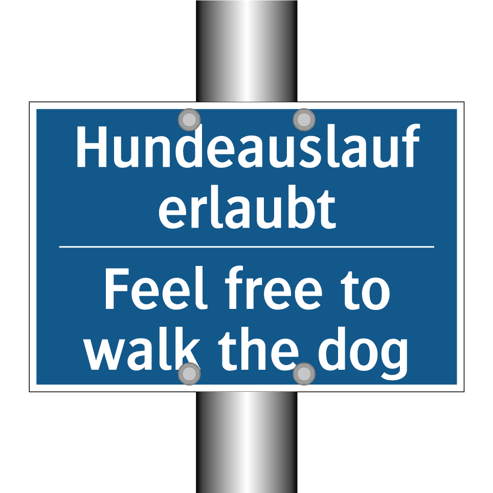 Zweisprachiges Verbotsschild mit deutschem Text Hundeauslauf erlaubt und englischem Text Feel free to walk the dog
