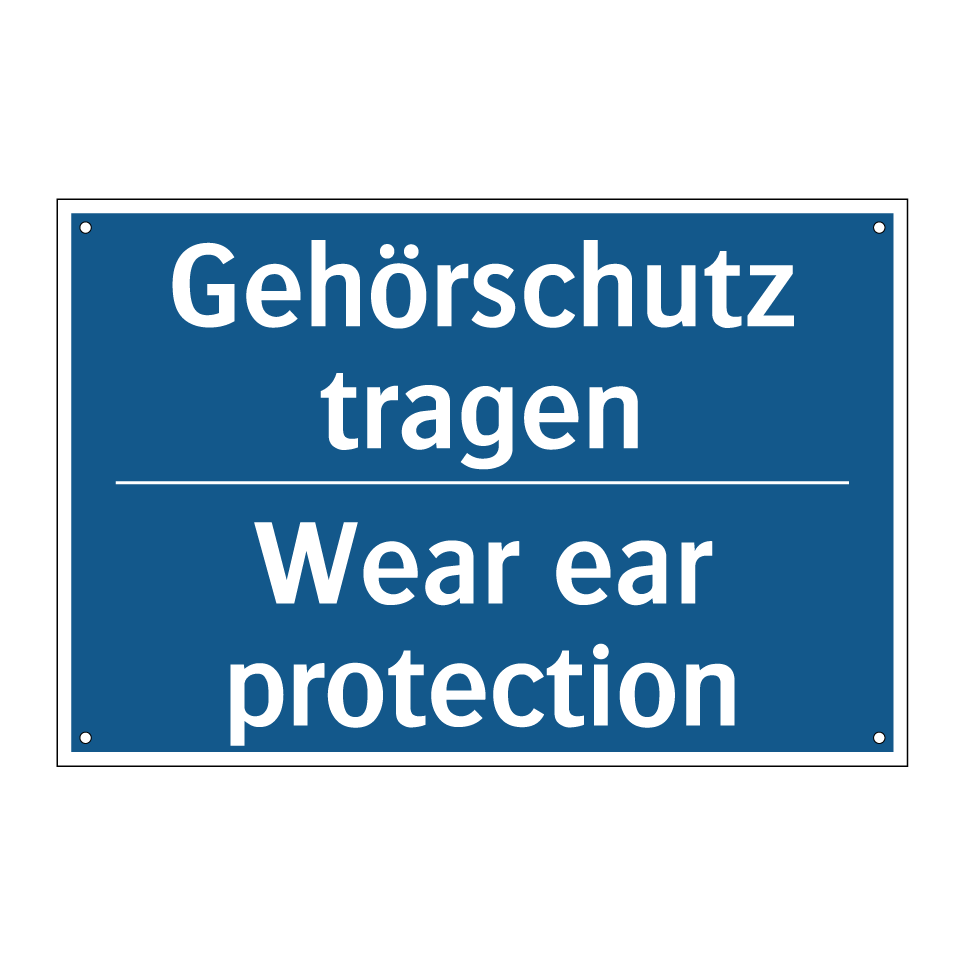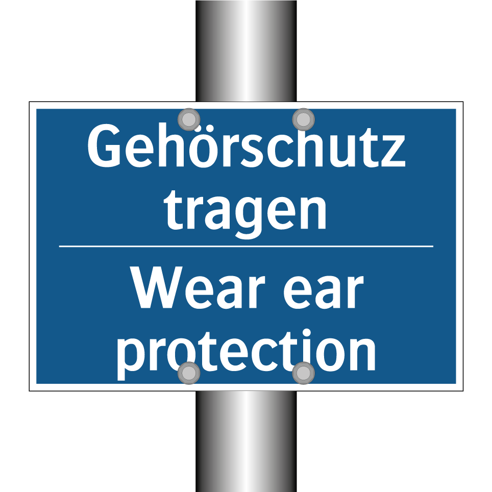 Zweisprachiges Verbotsschild mit deutschem Text Gehörschutz tragen und englischem Text Wear ear protection