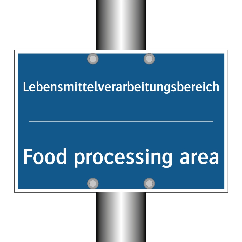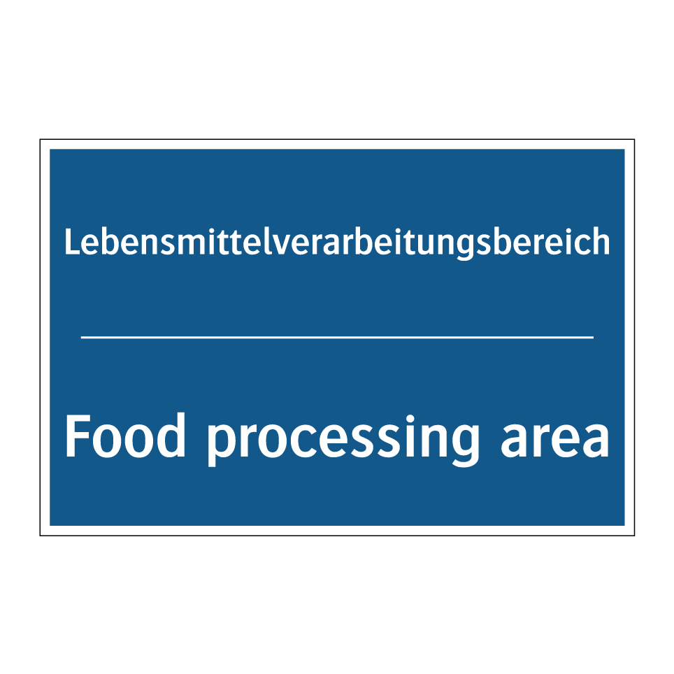 Zweisprachiges Verbotsschild mit deutschem Text Lebensmittelverarbeitungsbereich und englischem Text Food processing area