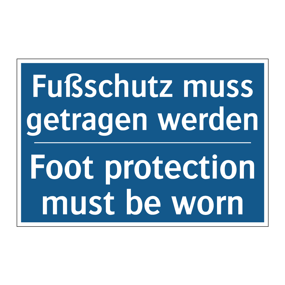 Zweisprachiges Verbotsschild mit deutschem Text Fußschutz muss getragen werden und englischem Text Foot protection must be worn