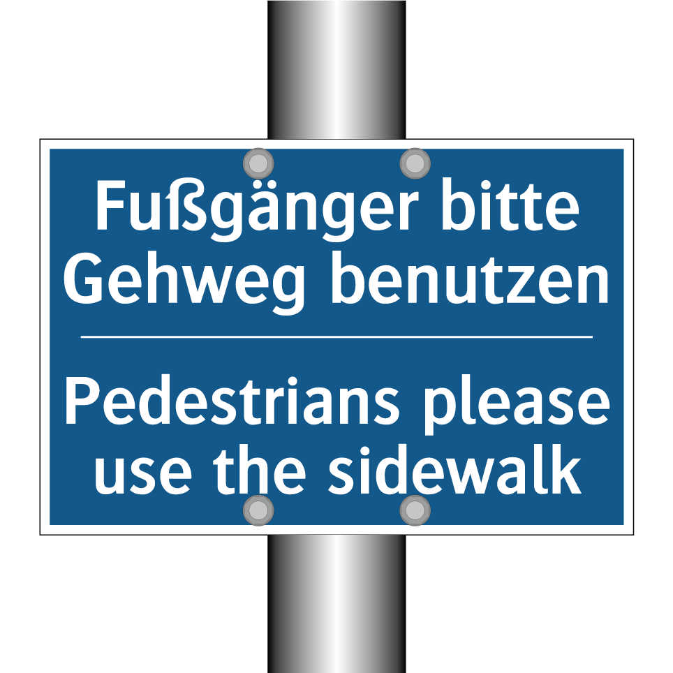 Zweisprachiges Verbotsschild mit deutschem Text Fußgänger bitte Gehweg benutzen und englischem Text Pedestrians please use the sidewalk