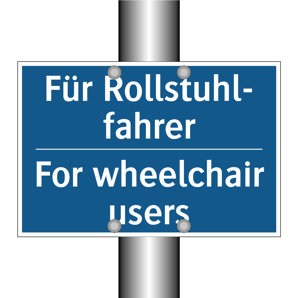 Diese Gebotsschild mit blauer Hintergrundfarbe und weißer Schrift ist ideal für die Kennzeichnung von Bereichen, die für Rollstuhlfahrer zugänglich sind. Dank der zweisprachigen Beschriftung auf Deutsch und Englisch ist sie besonders nützlich in internationalen Umgebungen wie Flughäfen, Bahnhöfen oder großen Einkaufszentren. Die klare und deutliche Darstellung sorgt dafür, dass die Botschaft leicht verständlich ist, was die Barrierefreiheit fördert. Diese Gebotsschild kann an Eingängen, Aufzügen oder speziellen Parkplätzen angebracht werden, um sicherzustellen, dass Menschen mit Mobilitätseinschränkungen die benötigte Unterstützung finden. Die zweisprachige Ausführung erhöht die Sichtbarkeit und Verständlichkeit für ein breites Publikum.