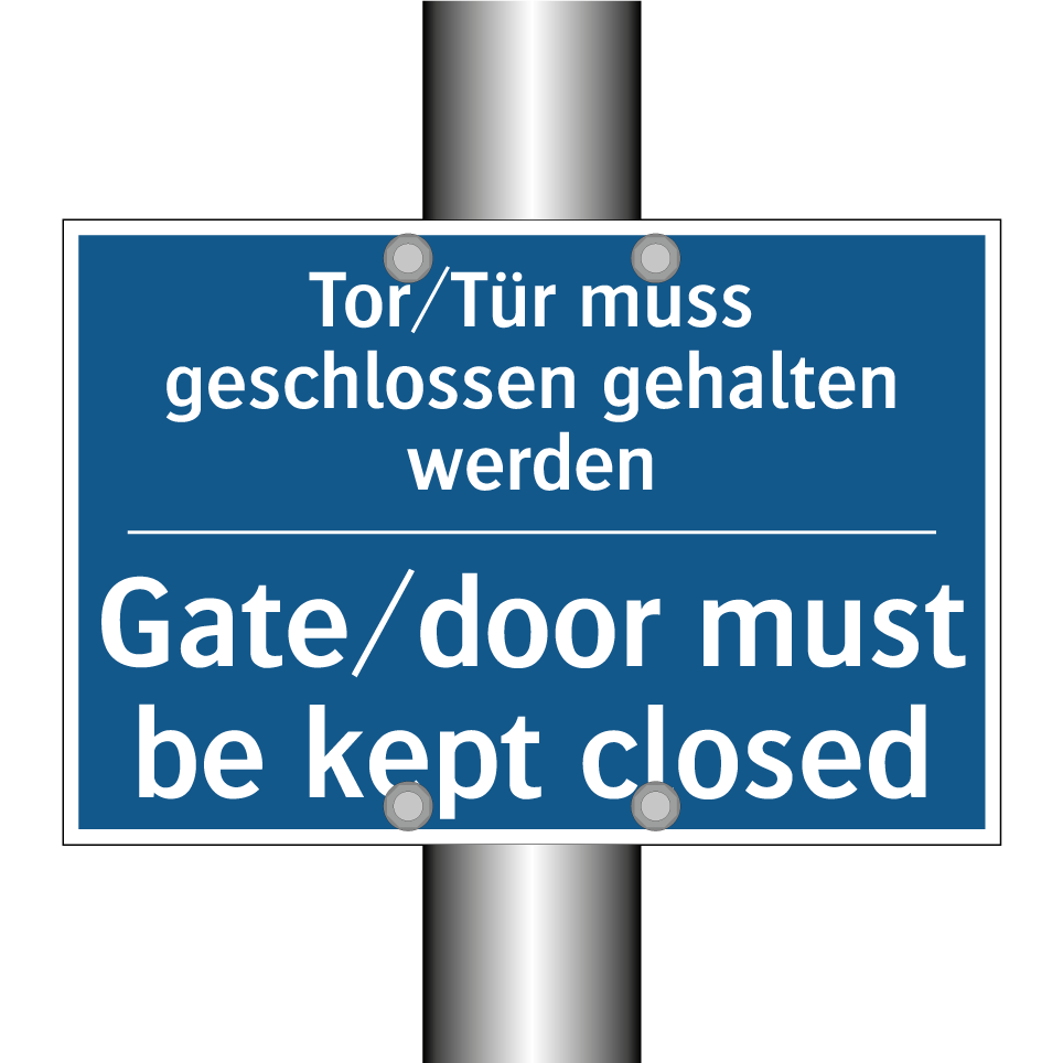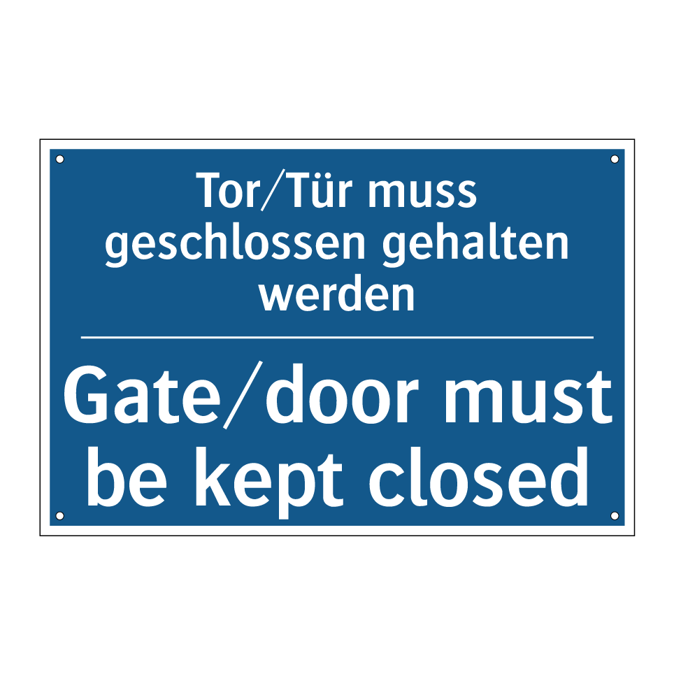 Zweisprachiges Verbotsschild mit deutschem Text Tor/Tür muss geschlossen gehalten werden und englischem Text Gate/door must be kept closed