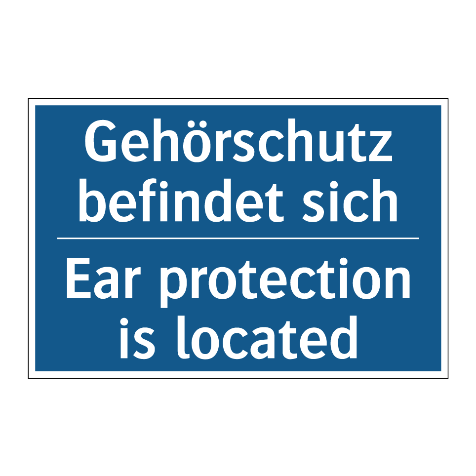 Zweisprachiges Verbotsschild mit deutschem Text Gehörschutz befindet sich und englischem Text Ear protection is located