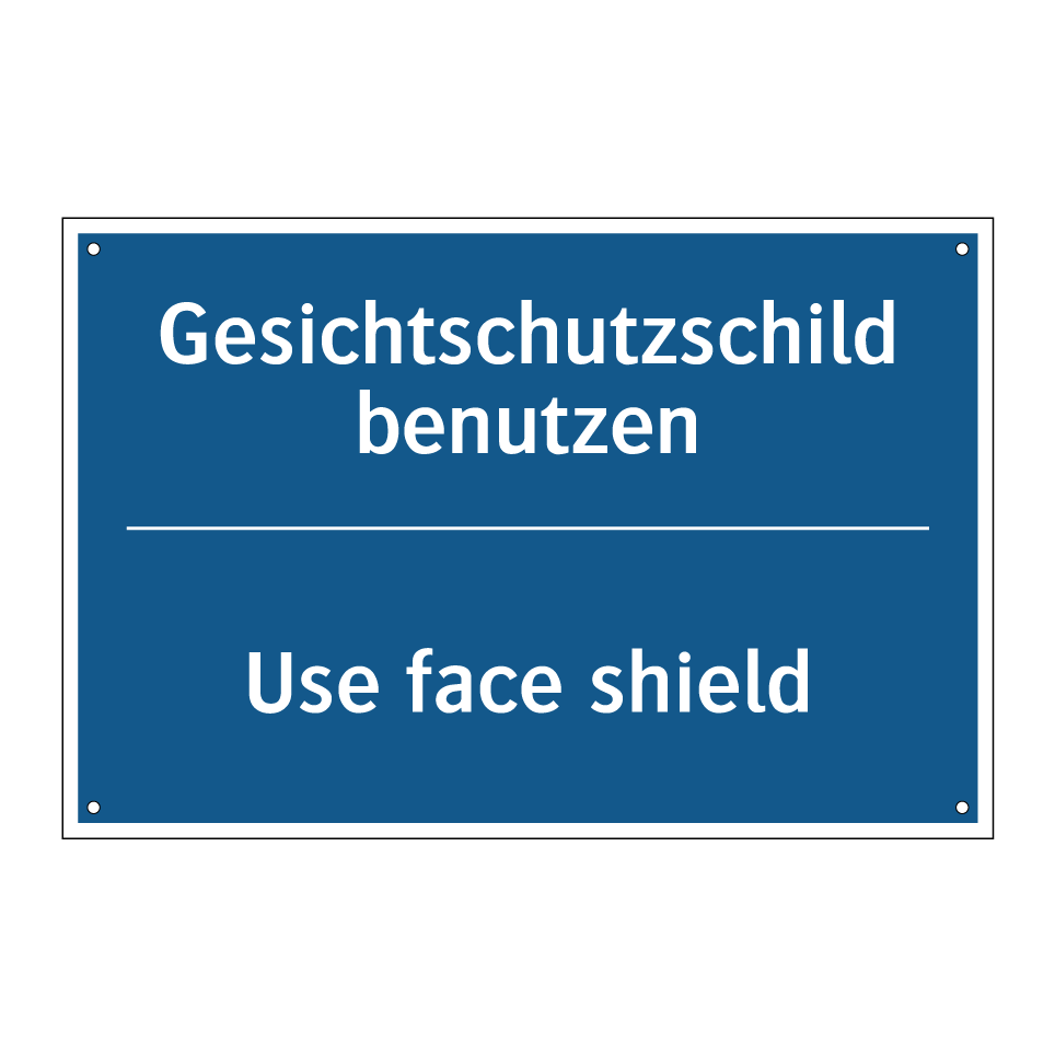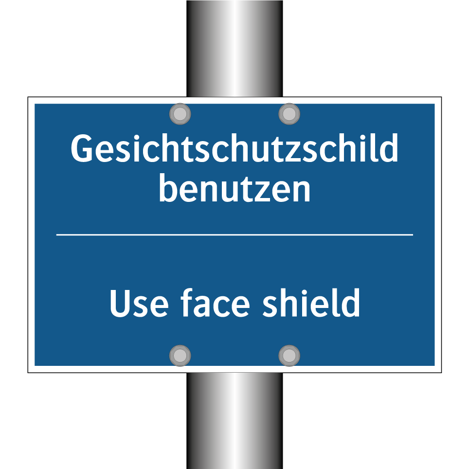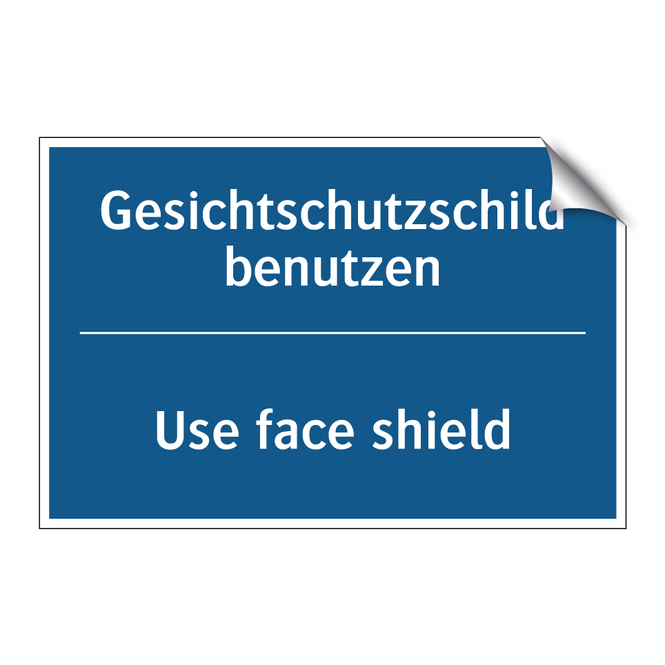 Zweisprachiges Verbotsschild mit deutschem Text Gesichtschutzschild benutzen und englischem Text Use face shield
