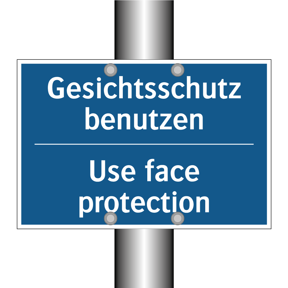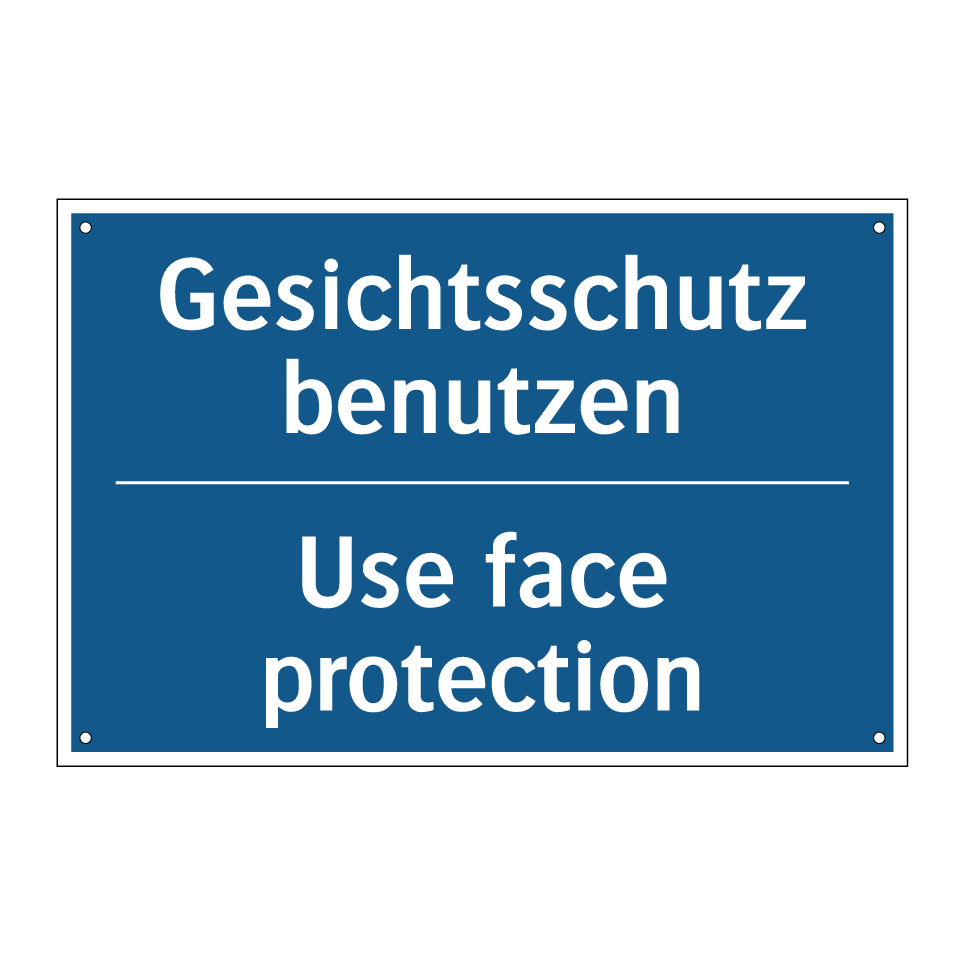 Zweisprachiges Verbotsschild mit deutschem Text Gesichtsschutz benutzen und englischem Text Use face protection