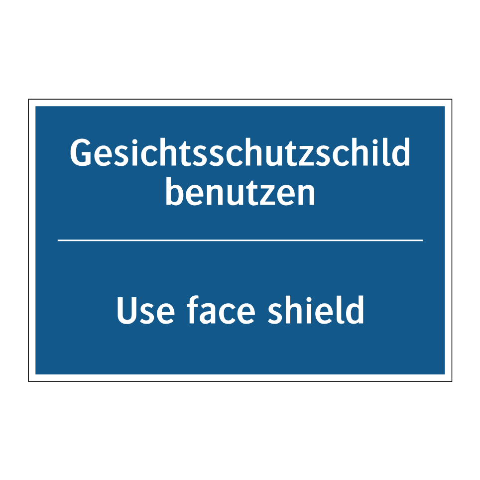 Zweisprachiges Verbotsschild mit deutschem Text Gesichtsschutzschild benutzen und englischem Text Use face shield