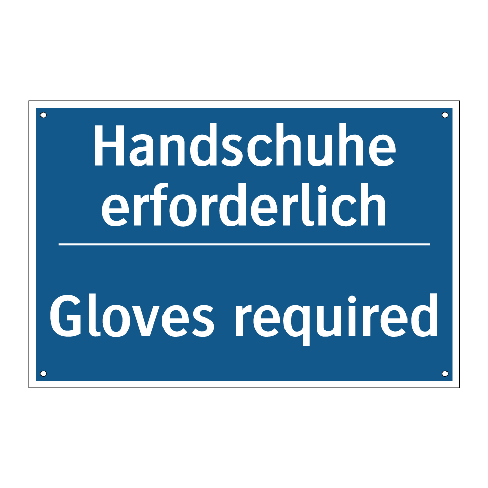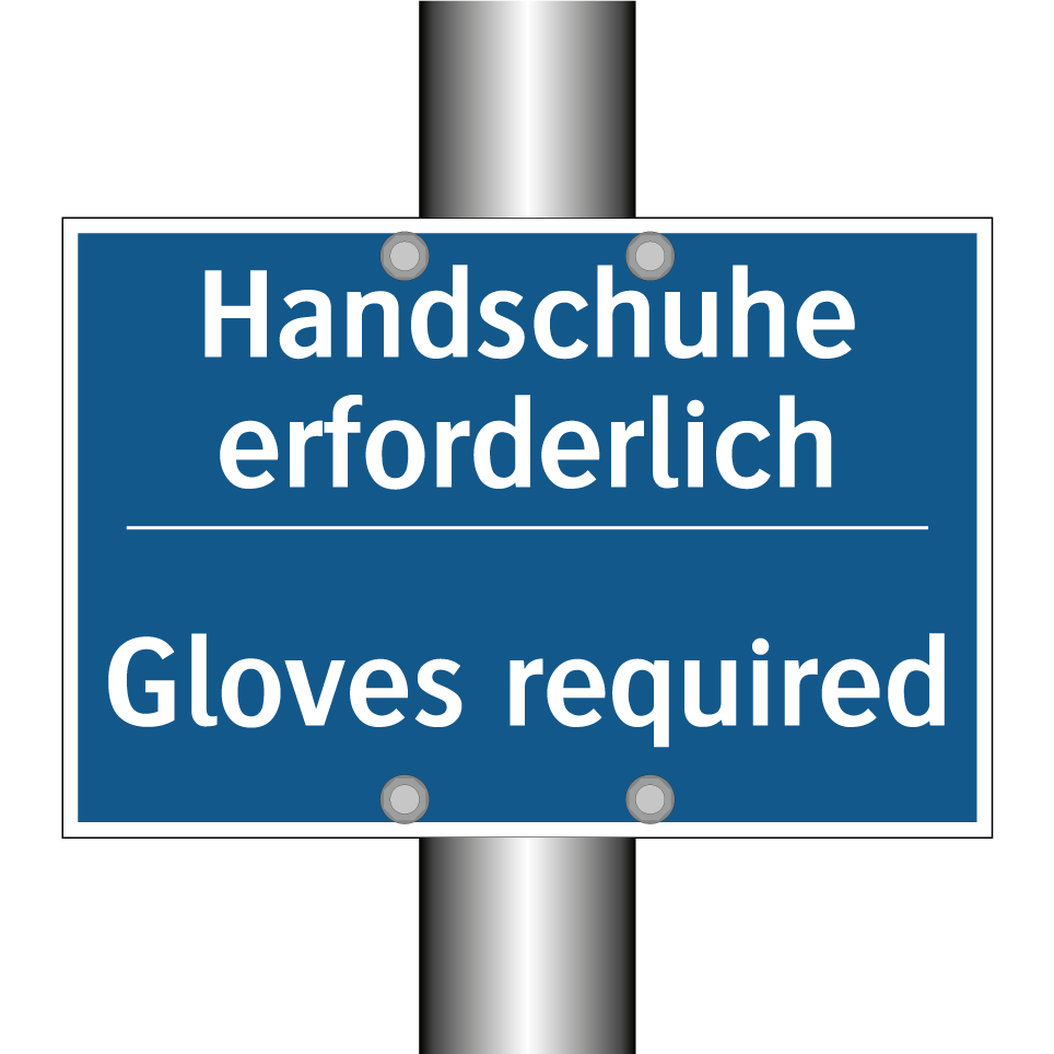 Zweisprachiges Verbotsschild mit deutschem Text Handschuhe erforderlich und englischem Text Gloves required