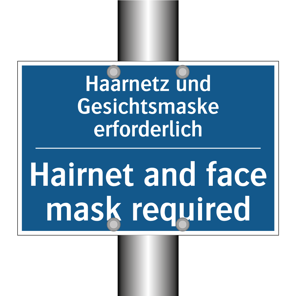 Zweisprachiges Verbotsschild mit deutschem Text Haarnetz und Gesichtsmaske erforderlich und englischem Text Hairnet and face mask required