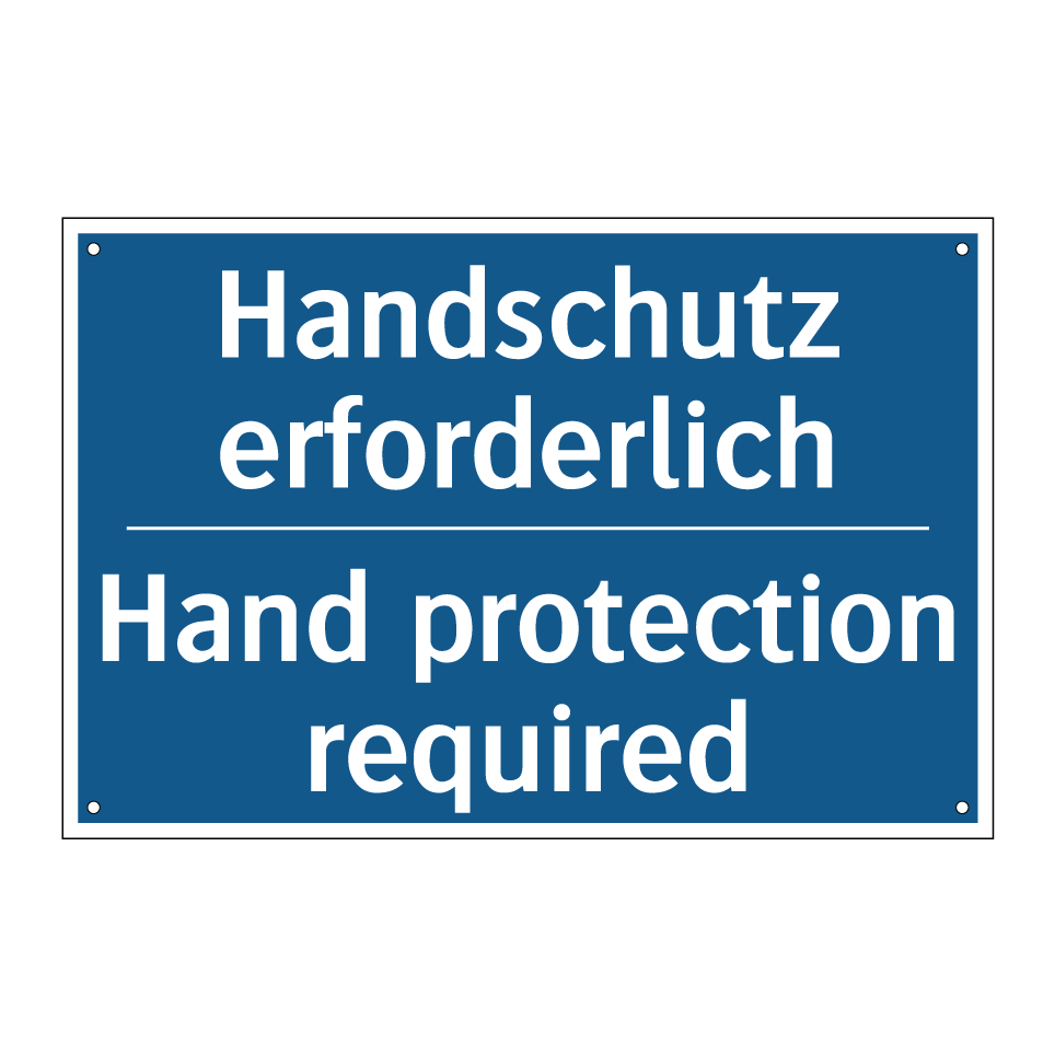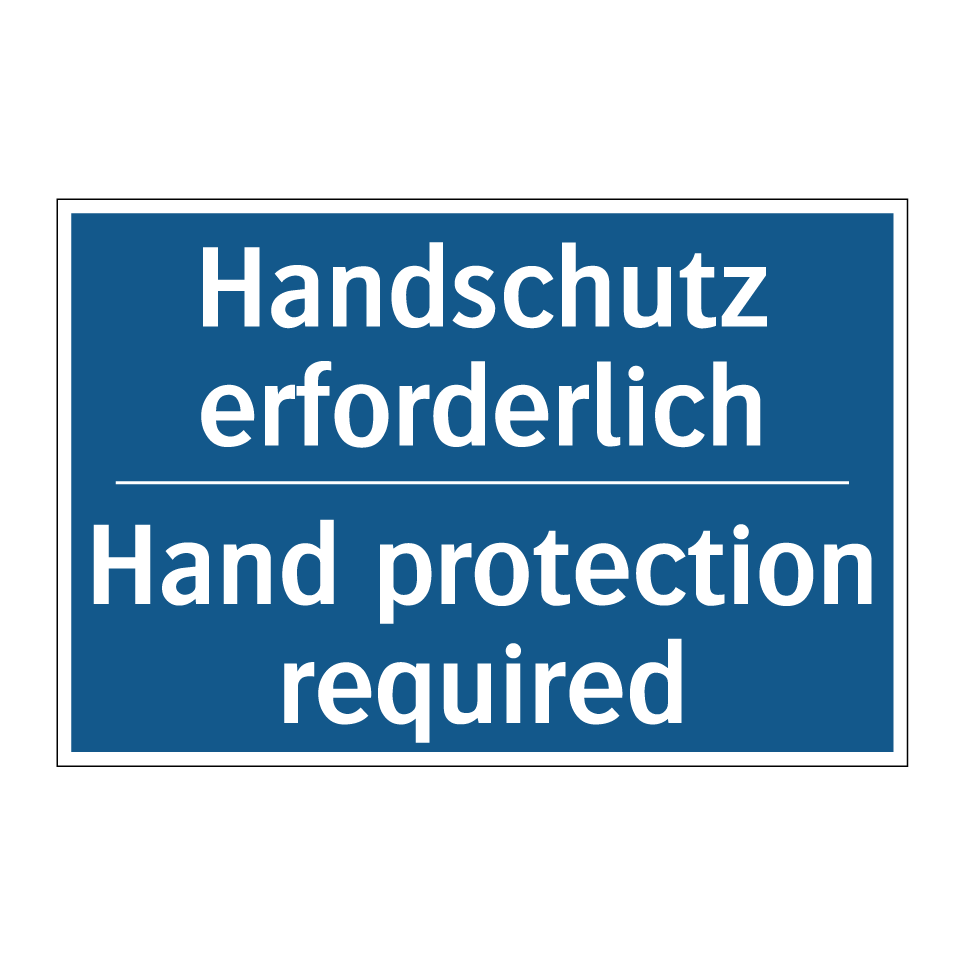 Zweisprachiges Verbotsschild mit deutschem Text Handschutz erforderlich und englischem Text Hand protection required