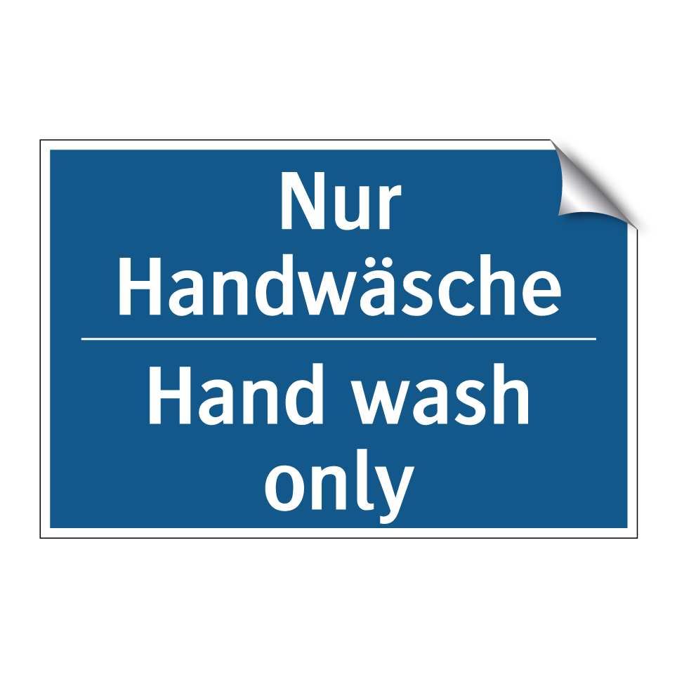 Zweisprachiges Verbotsschild mit deutschem Text Nur Handwäsche und englischem Text Hand wash only