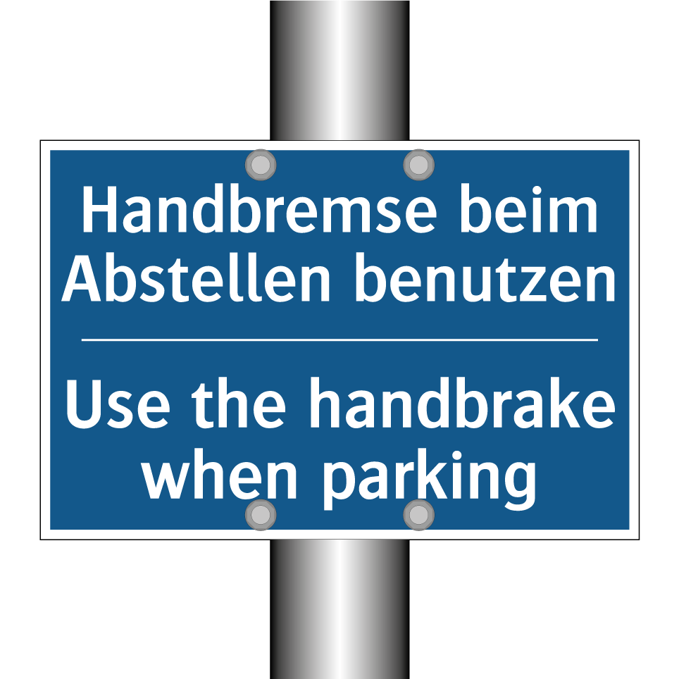 Entdecken Sie die Vielseitigkeit dieser Gebotsschild, die sowohl auf Deutsch als auch auf Englisch klare Anweisungen gibt. Diese zweisprachige Beschilderung ist ideal für Parkplätze, Garagen und andere Bereiche, in denen das sichere Abstellen von Fahrzeugen gewährleistet werden muss. Die deutliche Botschaft erinnert Fahrer daran, die Handbremse zu betätigen, um ungewolltes Wegrollen zu verhindern. Durch die zweisprachige Gestaltung wird sichergestellt, dass sowohl deutsch- als auch englischsprachige Personen die Anweisung verstehen, was die Sicherheit und Verständlichkeit erhöht. Platzieren Sie diese Gebotsschild an gut sichtbaren Stellen, um maximale Aufmerksamkeit und Einhaltung der Sicherheitsvorschriften zu gewährleisten.
