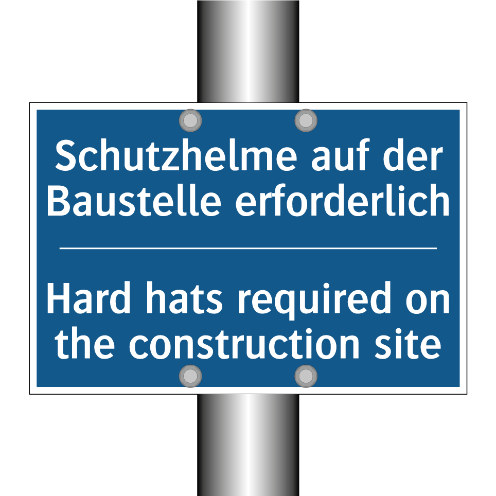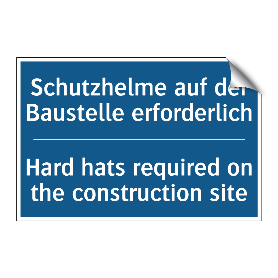 Zweisprachiges Verbotsschild mit deutschem Text Schutzhelme auf der Baustelle erforderlich und englischem Text Hard hats required on the construction site