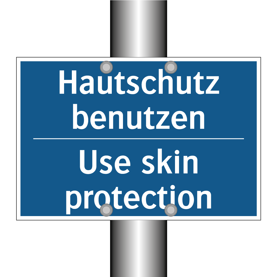 Zweisprachiges Verbotsschild mit deutschem Text Hautschutz benutzen und englischem Text Use skin protection