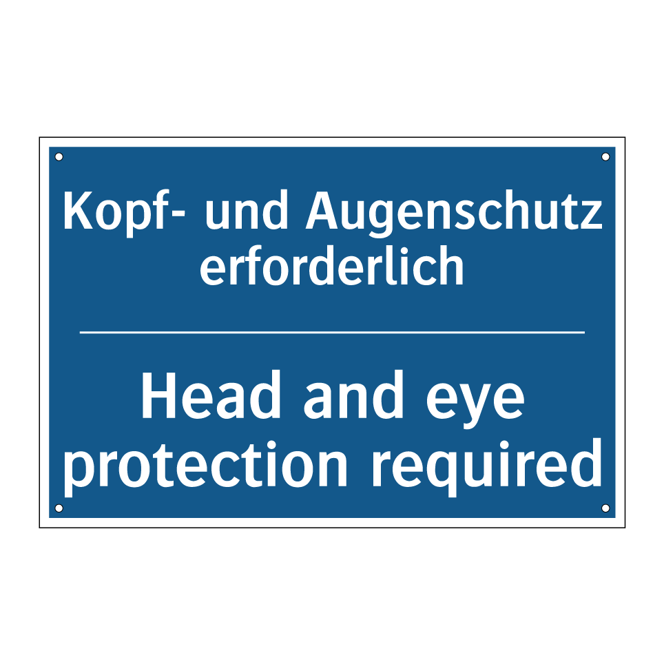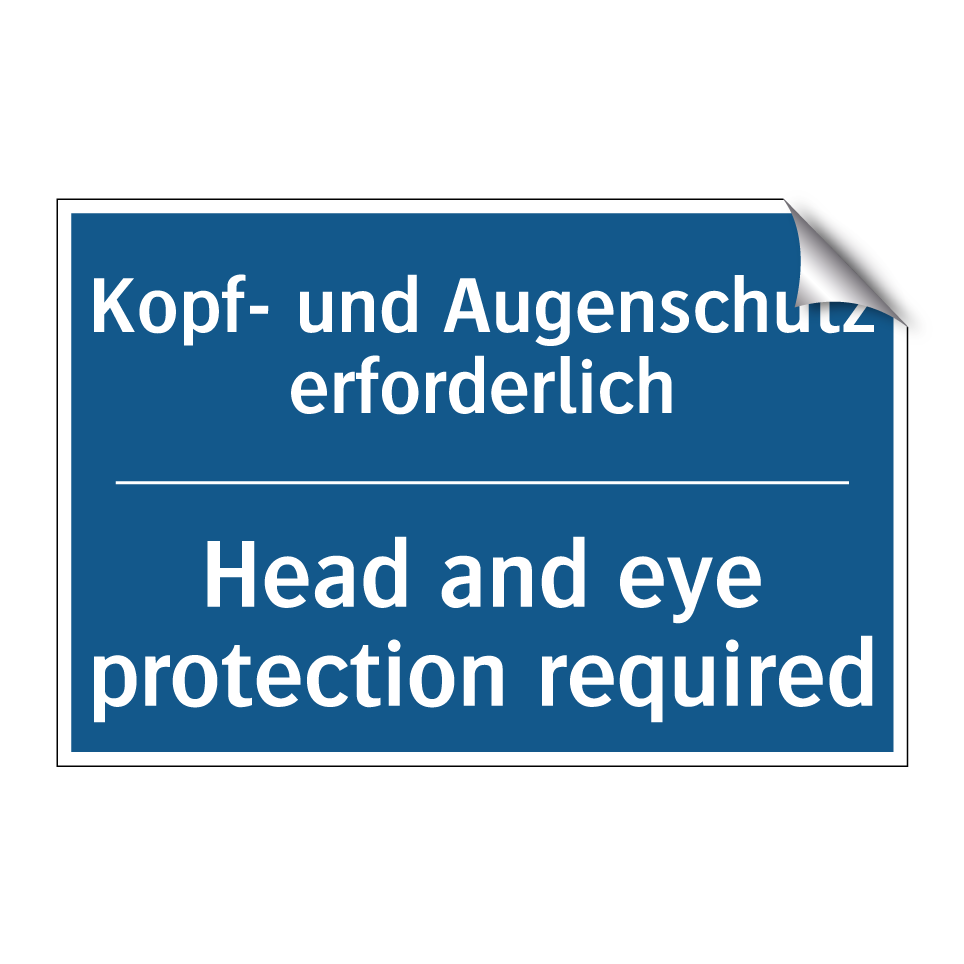 Zweisprachiges Verbotsschild mit deutschem Text Kopf- und Augenschutz erforderlich und englischem Text Head and eye protection required