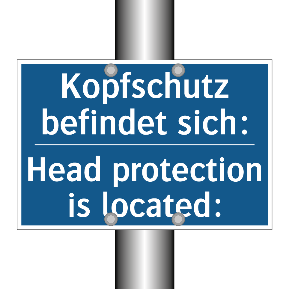 Zweisprachiges Verbotsschild mit deutschem Text Kopfschutz befindet sich: und englischem Text Head protection is located: