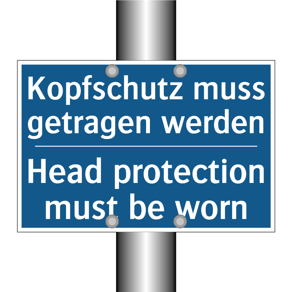 Zweisprachiges Verbotsschild mit deutschem Text Kopfschutz muss getragen werden und englischem Text Head protection must be worn