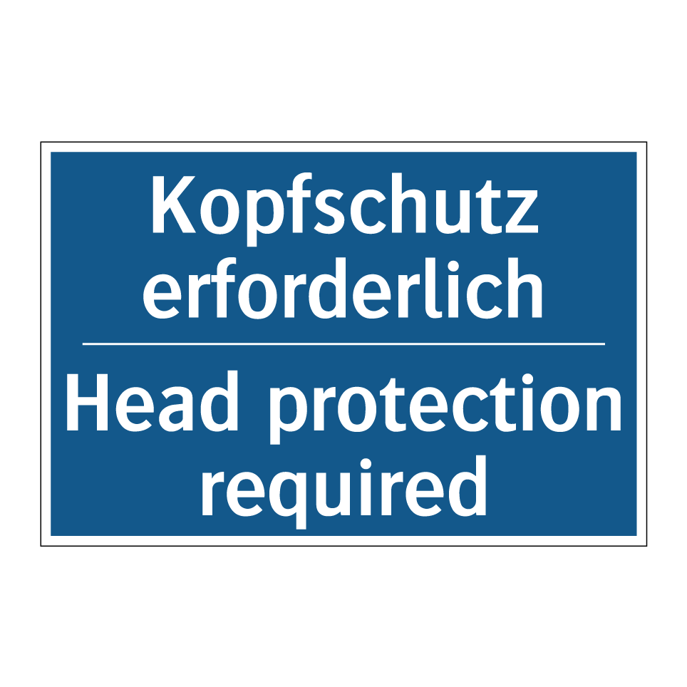Zweisprachiges Verbotsschild mit deutschem Text Kopfschutz erforderlich und englischem Text Head protection required