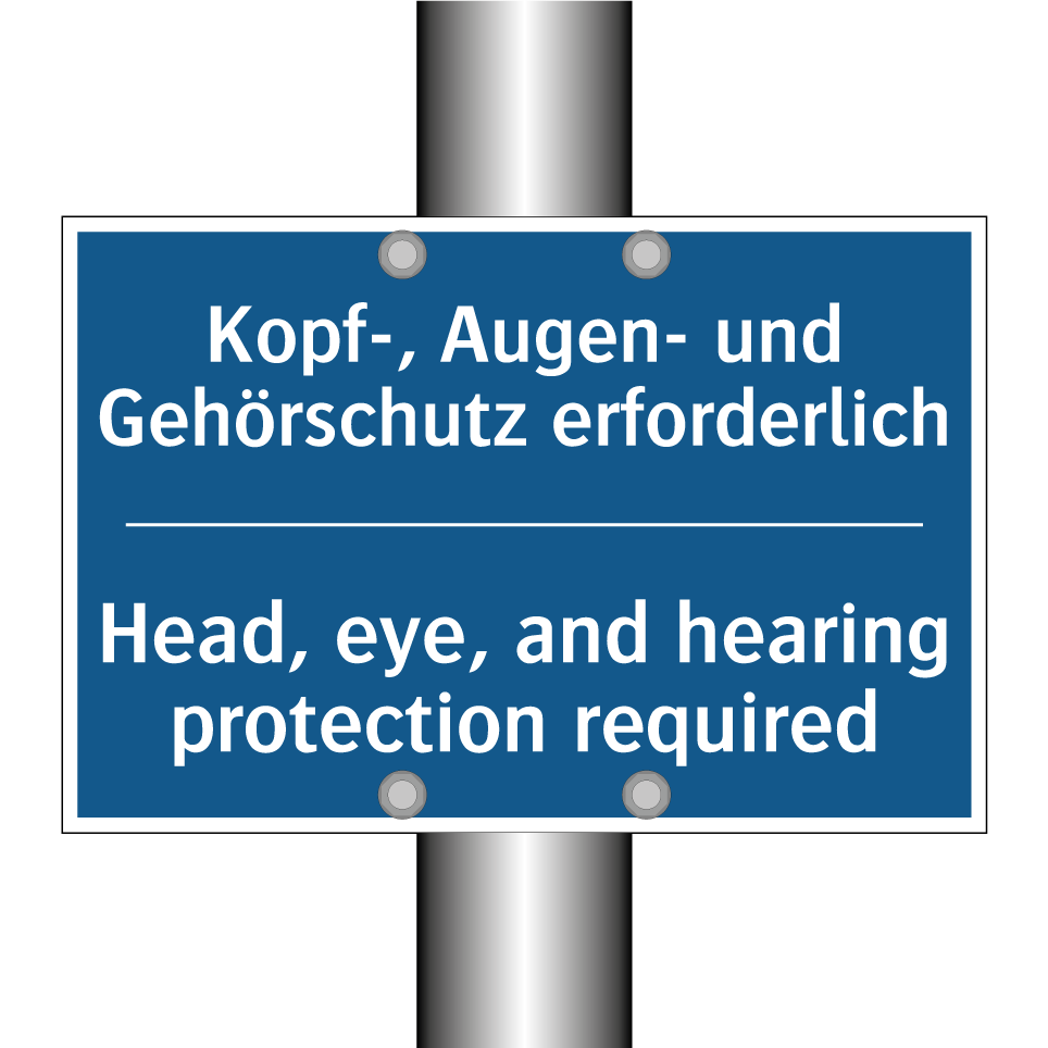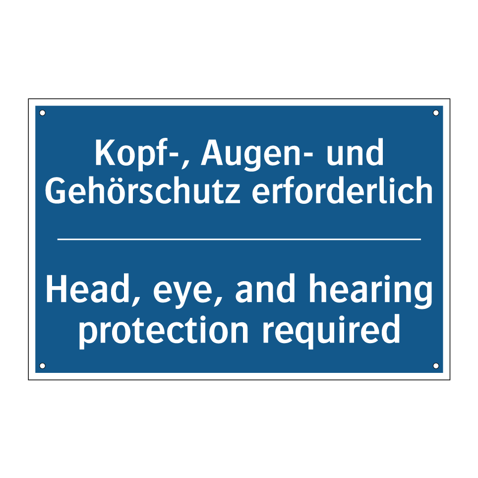 Zweisprachiges Verbotsschild mit deutschem Text Kopf-, Augen- und Gehörschutz erforderlich und englischem Text Head, eye, and hearing protection required