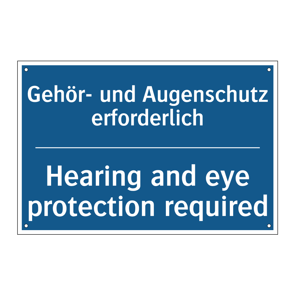 Zweisprachiges Verbotsschild mit deutschem Text Gehör- und Augenschutz erforderlich und englischem Text Hearing and eye protection required