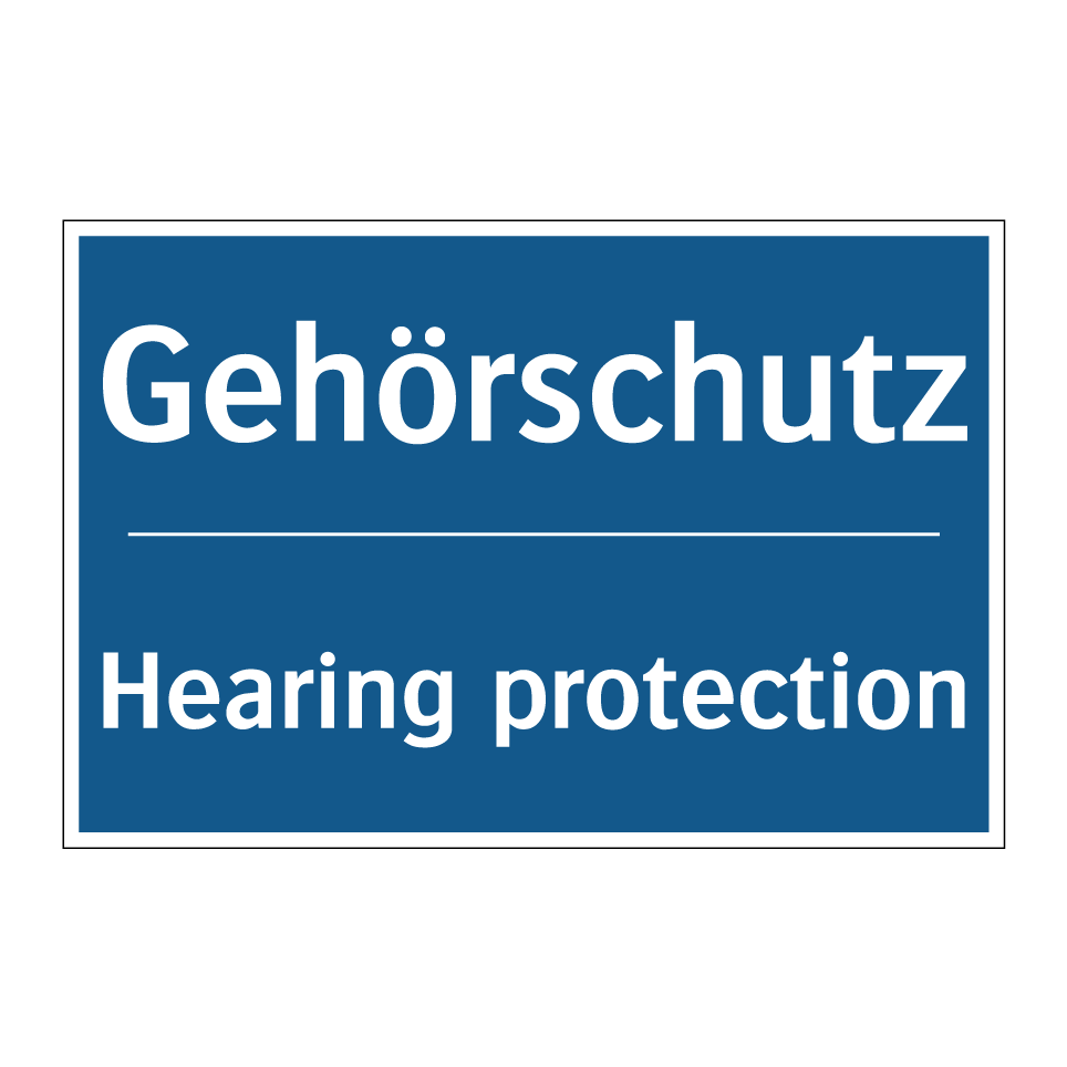 Zweisprachiges Verbotsschild mit deutschem Text Gehörschutz und englischem Text Hearing protection