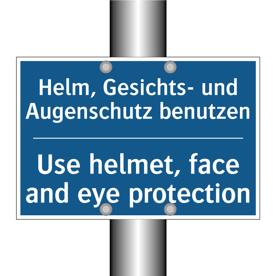 Zweisprachiges Verbotsschild mit deutschem Text Helm, Gesichts- und Augenschutz benutzen und englischem Text Use helmet, face and eye protection