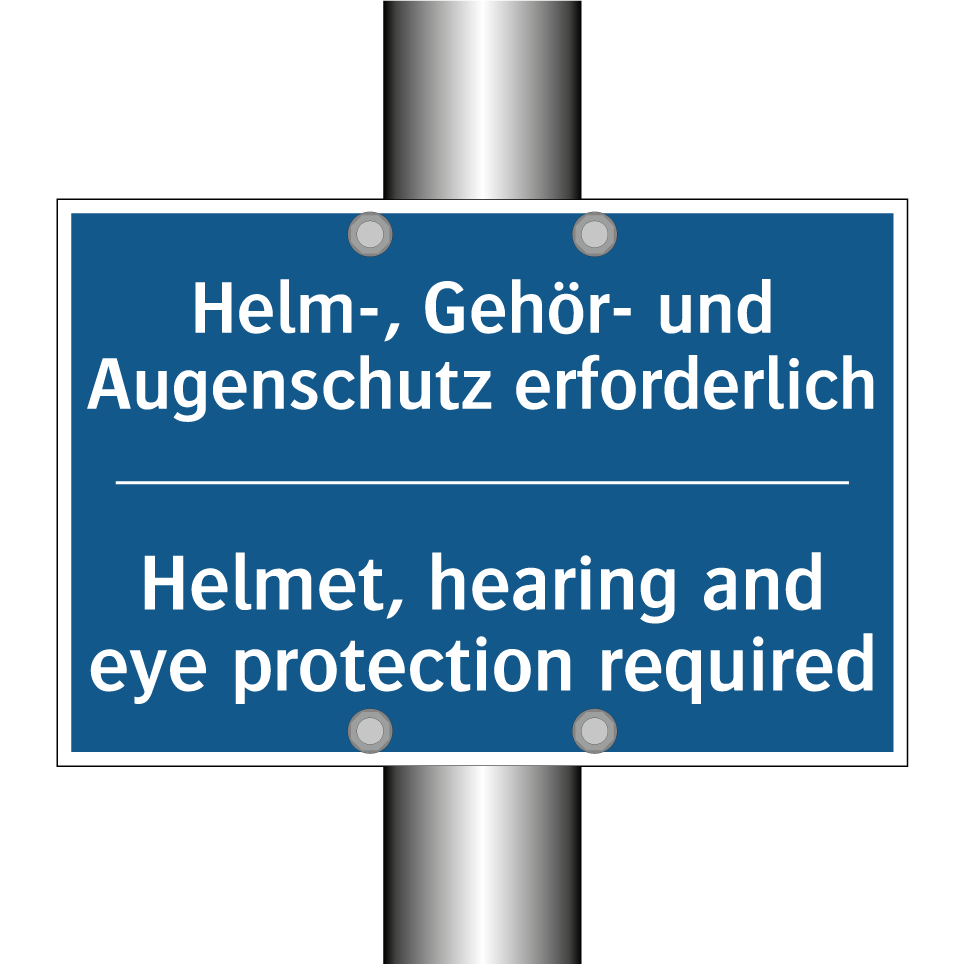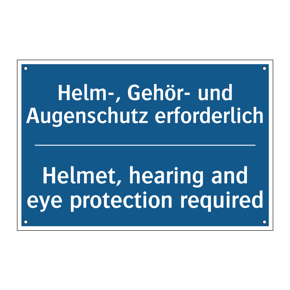 Zweisprachiges Verbotsschild mit deutschem Text Helm-, Gehör- und Augenschutz erforderlich und englischem Text Helmet, hearing and eye protection required