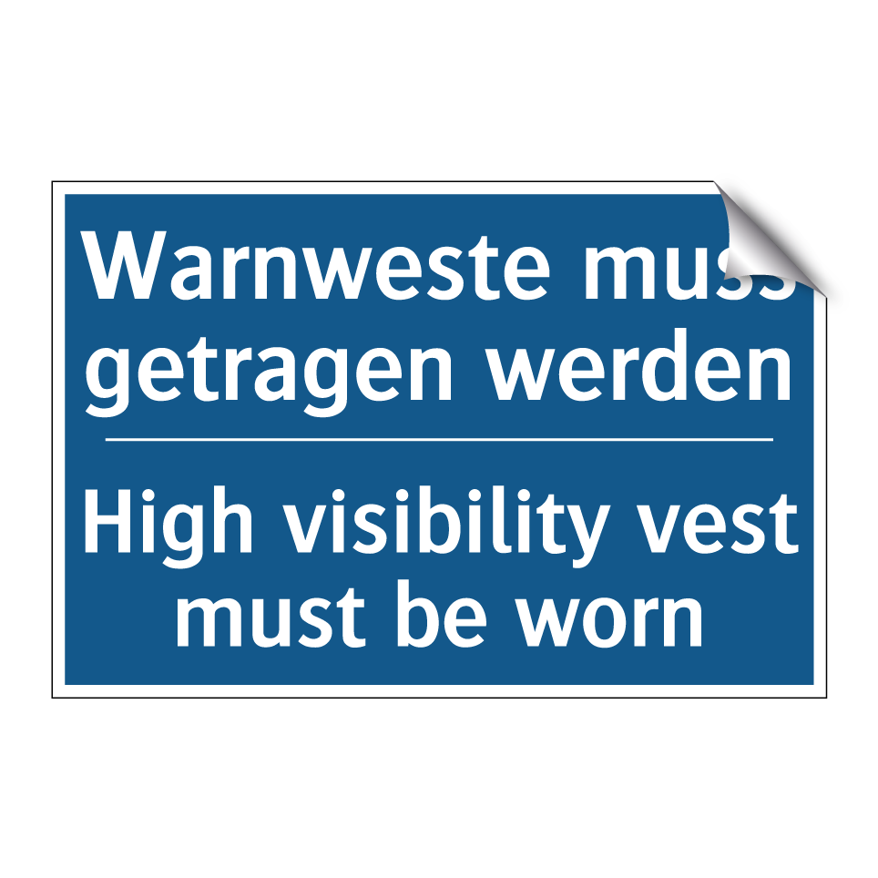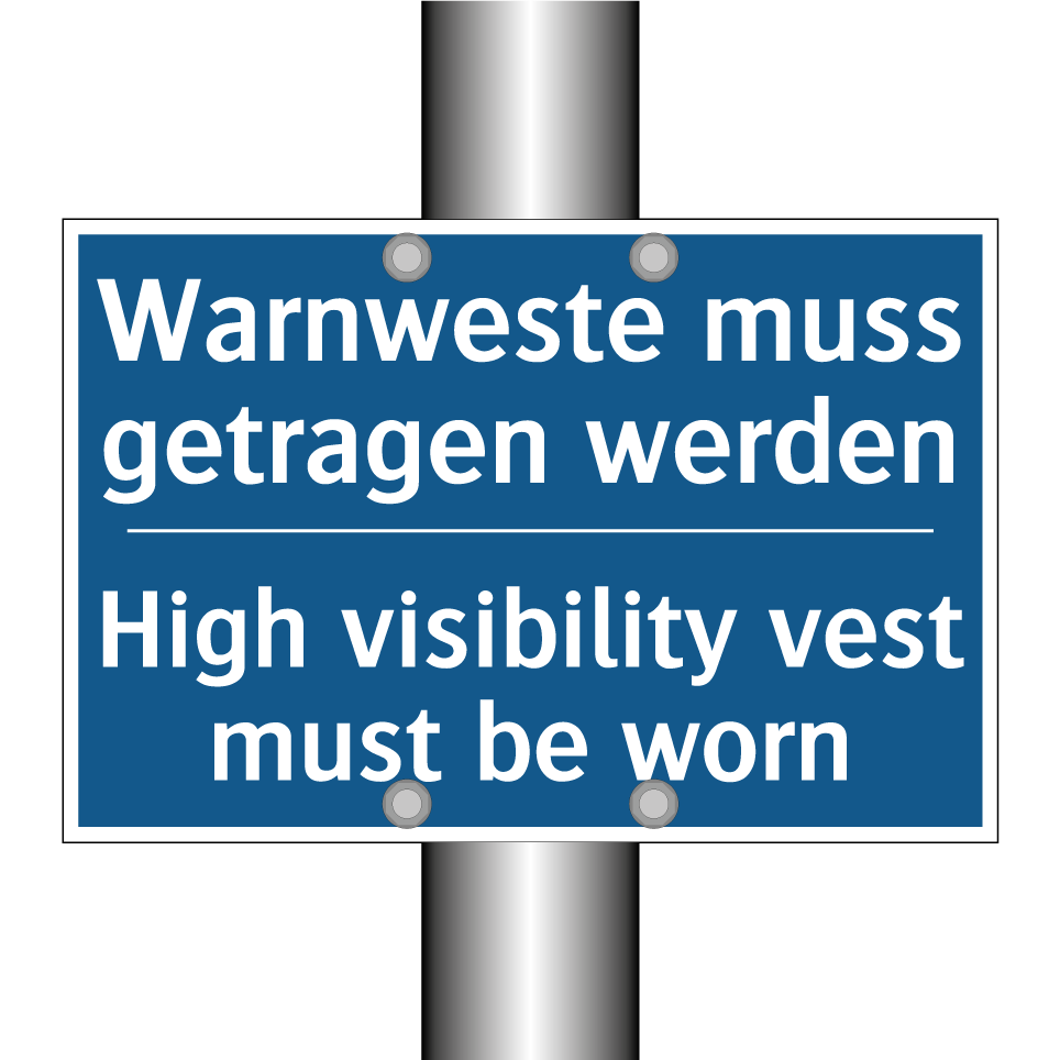 Zweisprachiges Verbotsschild mit deutschem Text Warnweste muss getragen werden und englischem Text High visibility vest must be worn