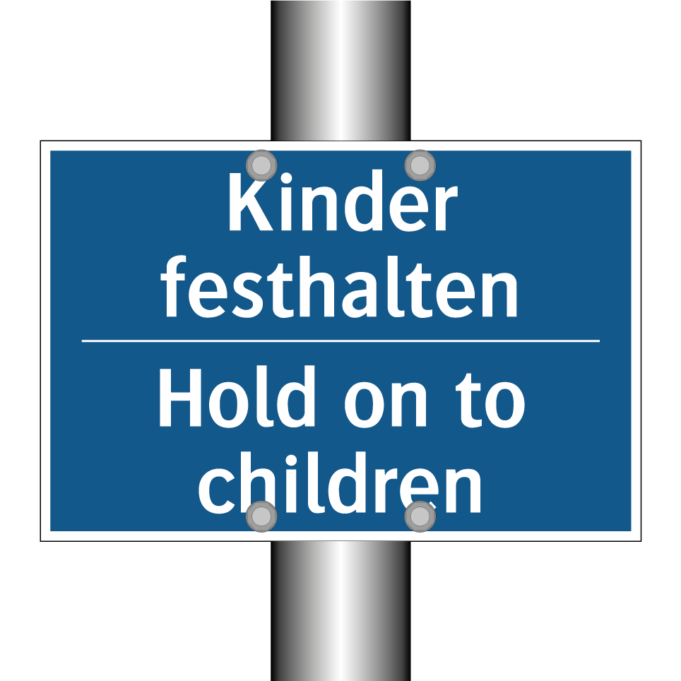 Zweisprachiges Verbotsschild mit deutschem Text Kinder festhalten und englischem Text Hold on to children
