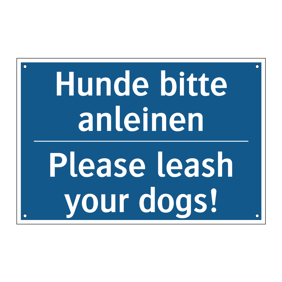 Zweisprachiges Verbotsschild mit deutschem Text Hunde bitte anleinen und englischem Text Please leash your dogs!