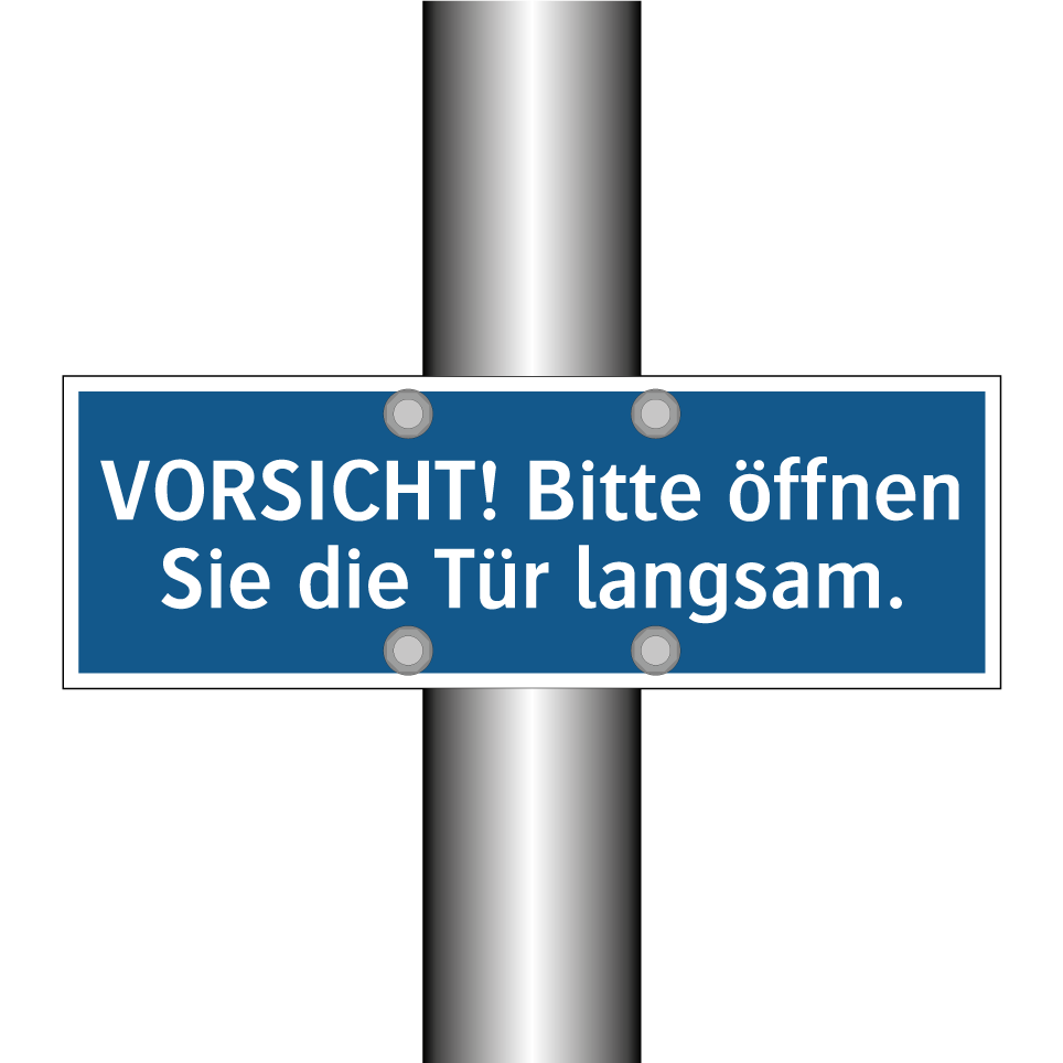 Gebotsschild mit dem Text VORSICHT! Bitte öffnen Sie die Tür langsam.