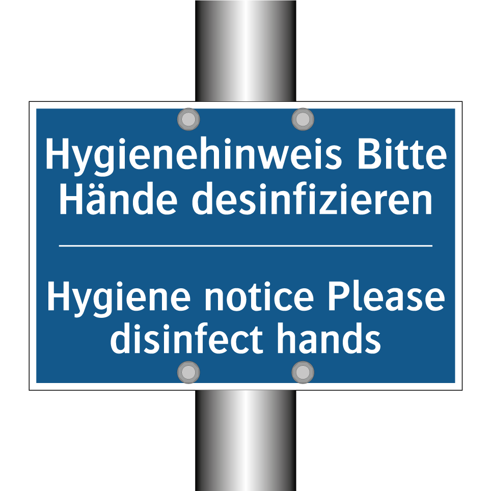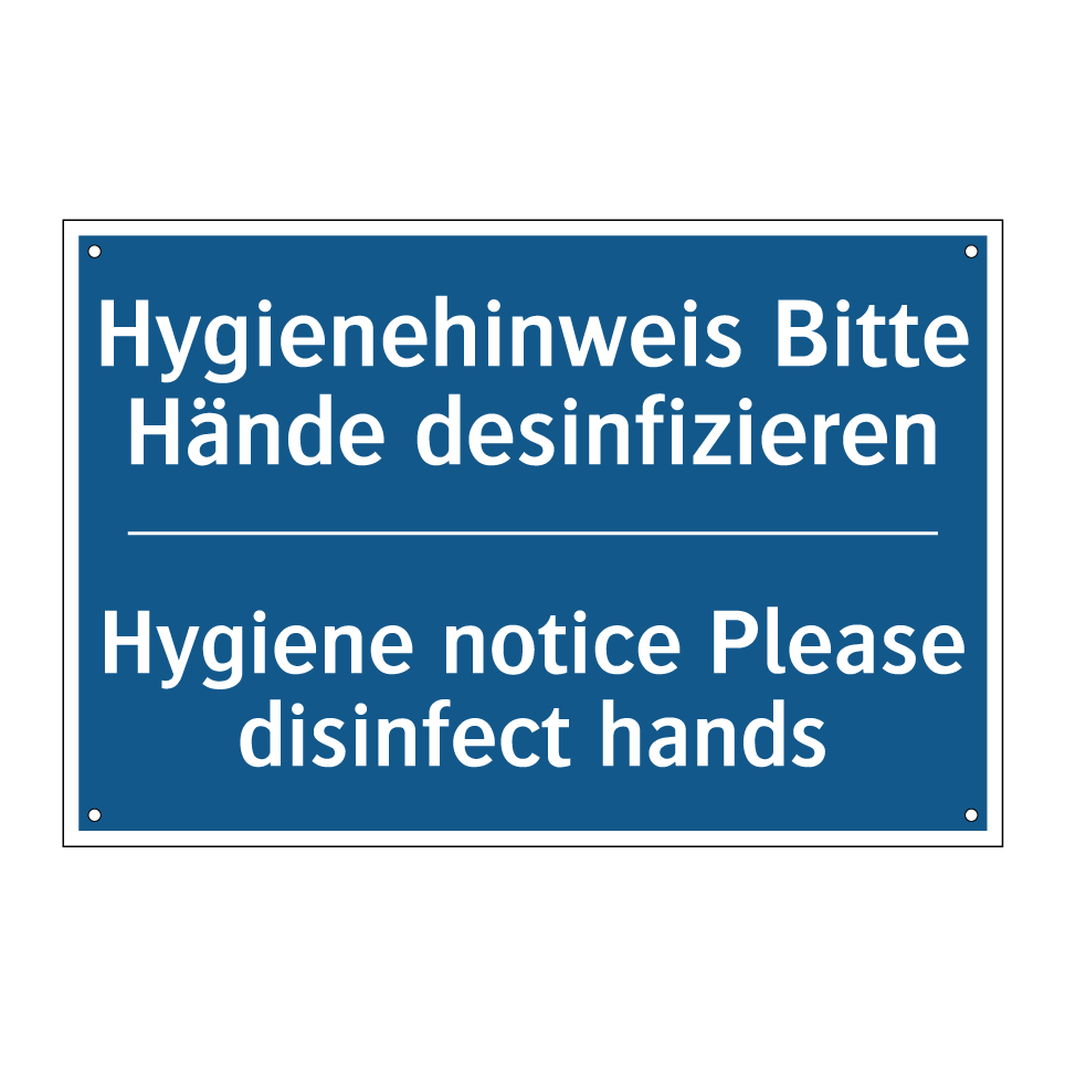 Zweisprachiges Verbotsschild mit deutschem Text Hygienehinweis Bitte Hände desinfizieren und englischem Text Hygiene notice Please disinfect hands