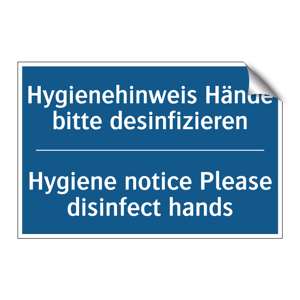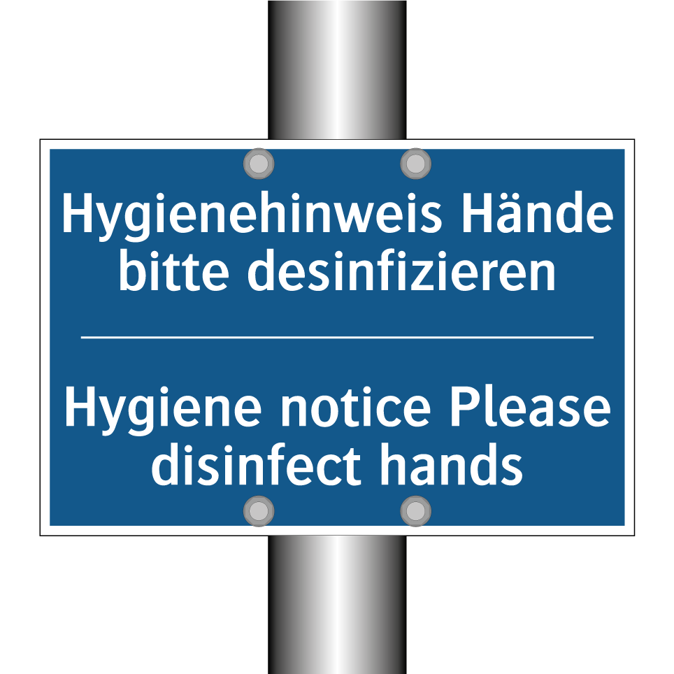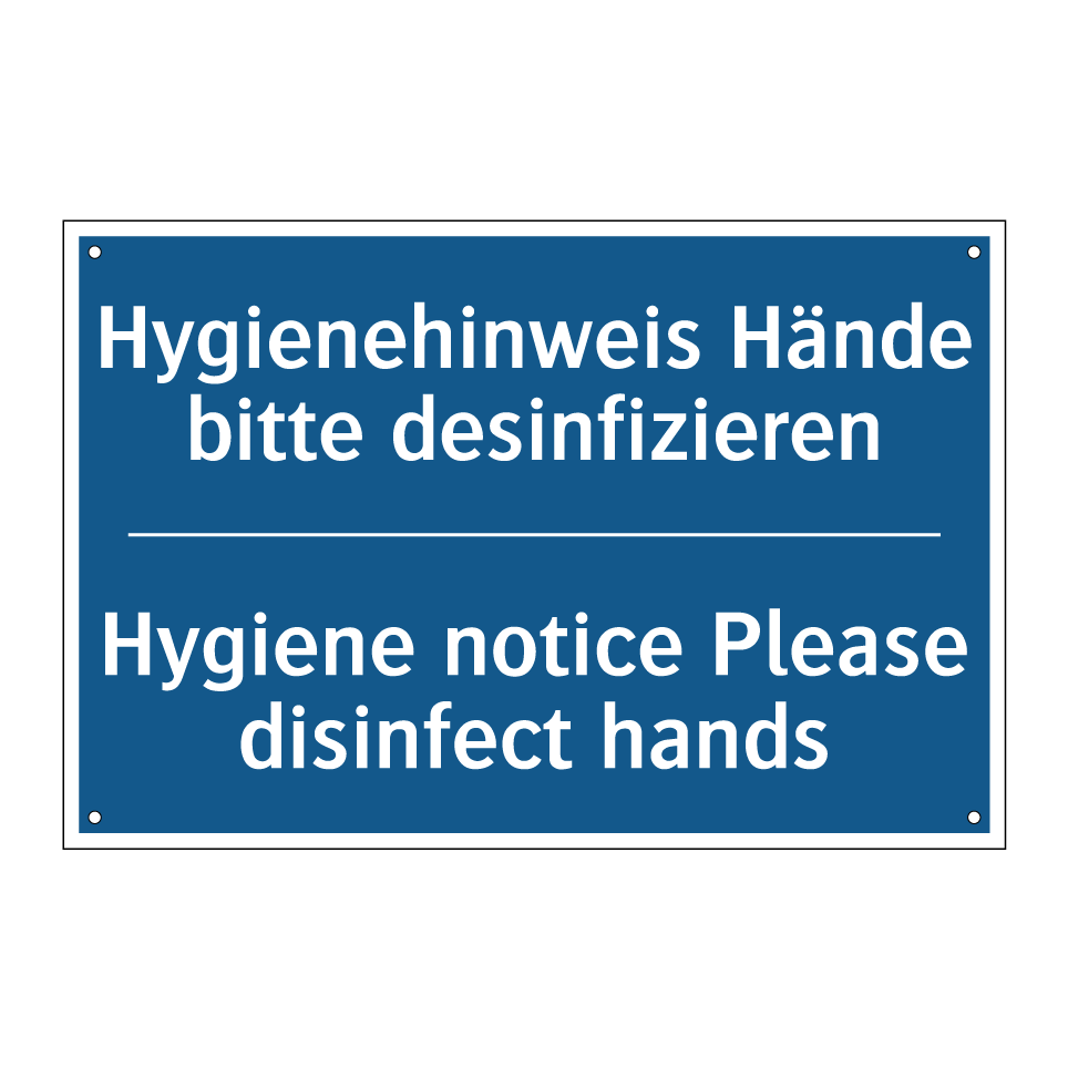 Zweisprachiges Verbotsschild mit deutschem Text Hygienehinweis Hände bitte desinfizieren und englischem Text Hygiene notice Please disinfect hands