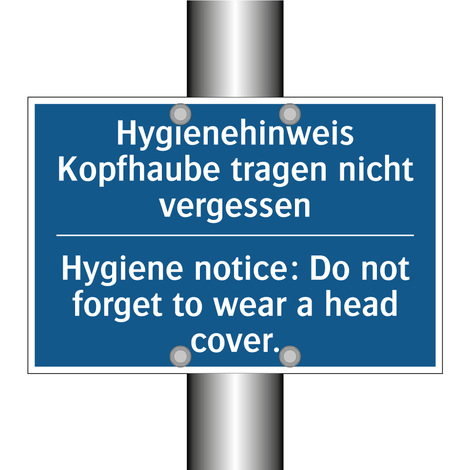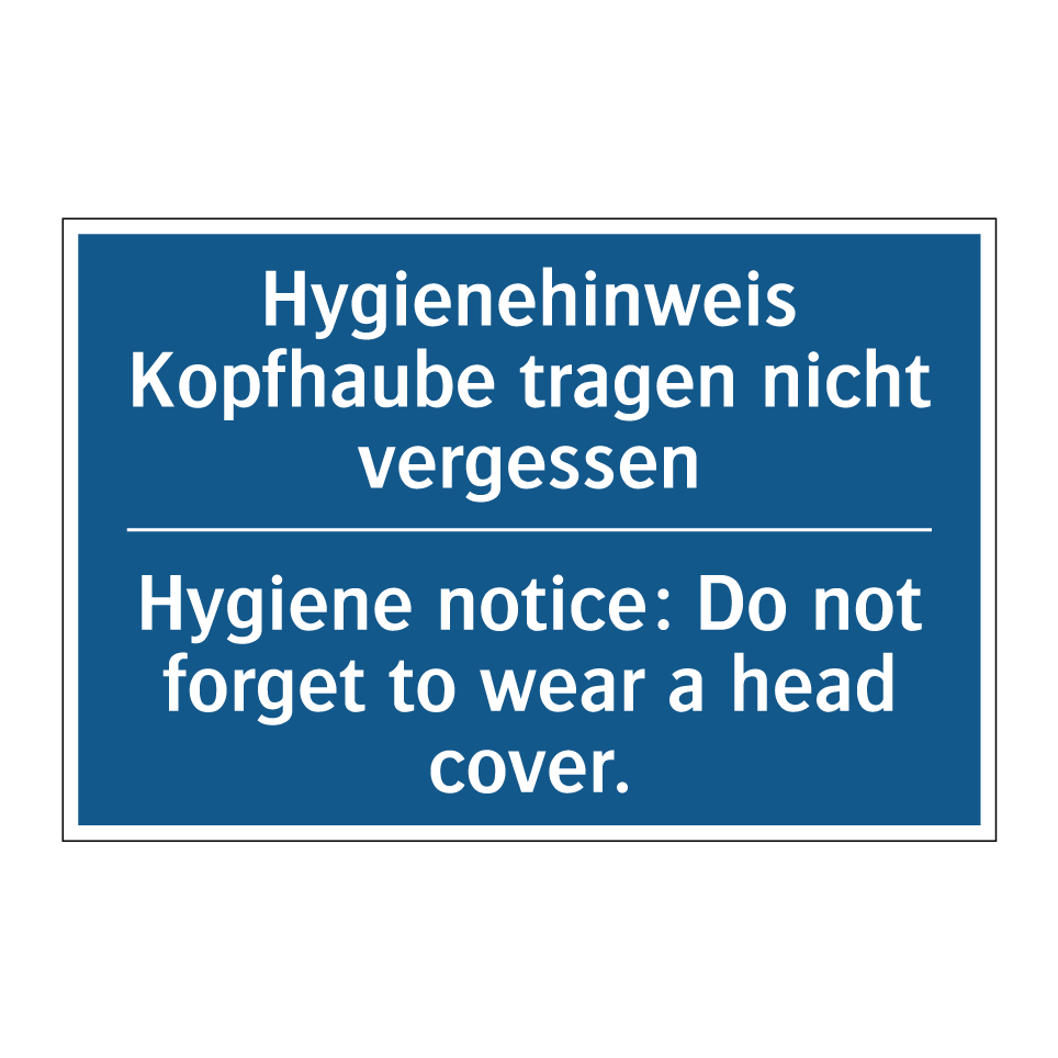 Zweisprachiges Verbotsschild mit deutschem Text Hygienehinweis Kopfhaube tragen nicht vergessen und englischem Text Hygiene notice: Do not forget to wear a head cover.