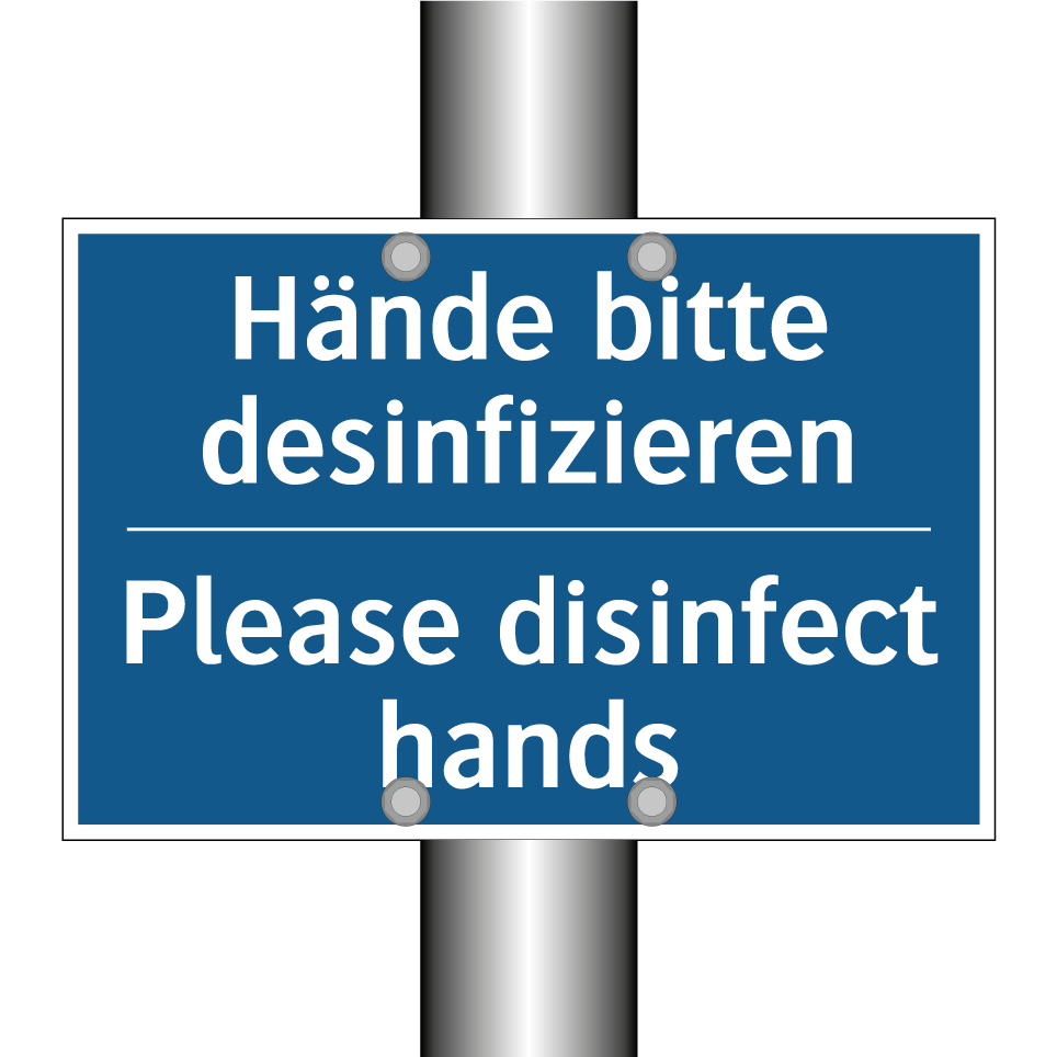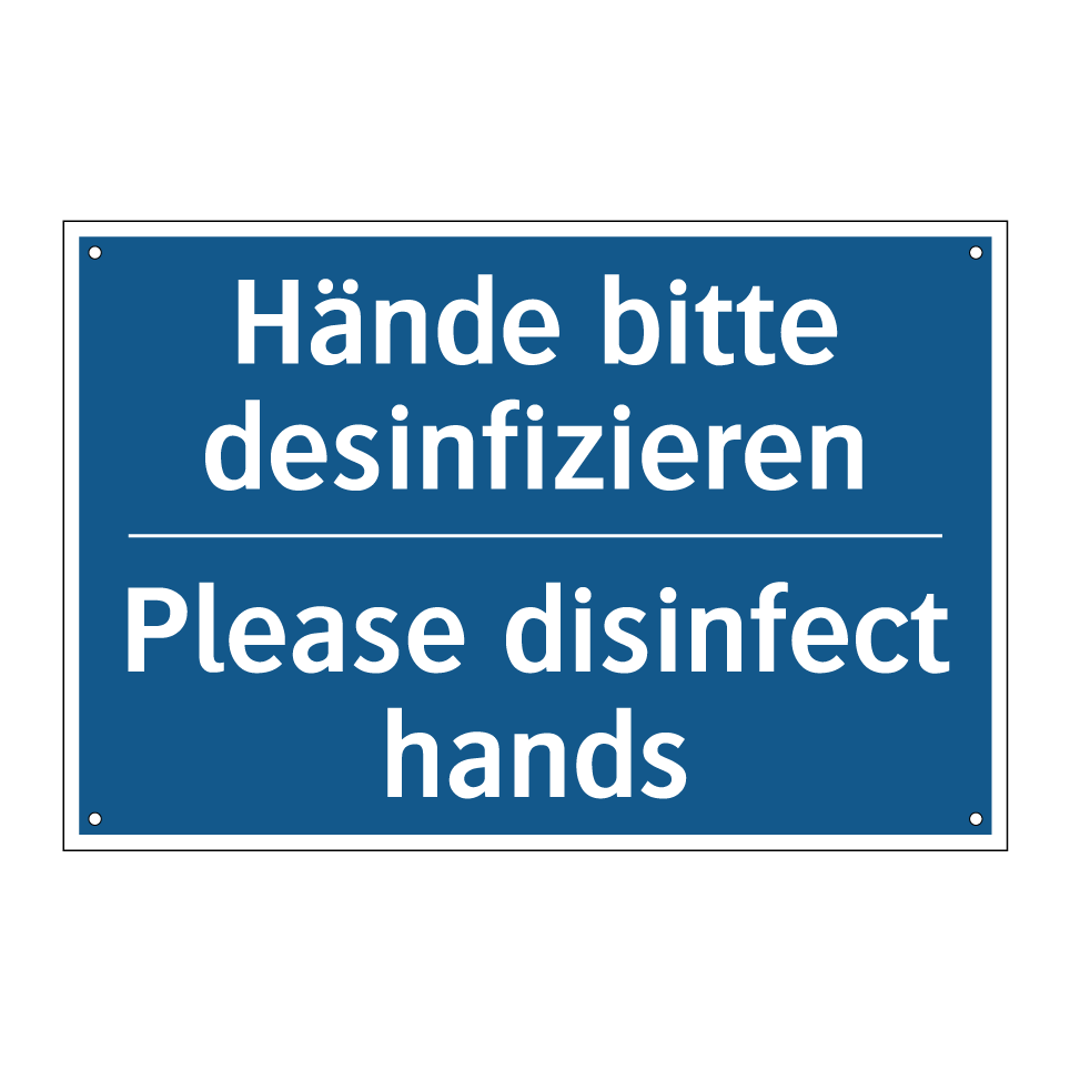 Zweisprachiges Verbotsschild mit deutschem Text Hände bitte desinfizieren und englischem Text Please disinfect hands