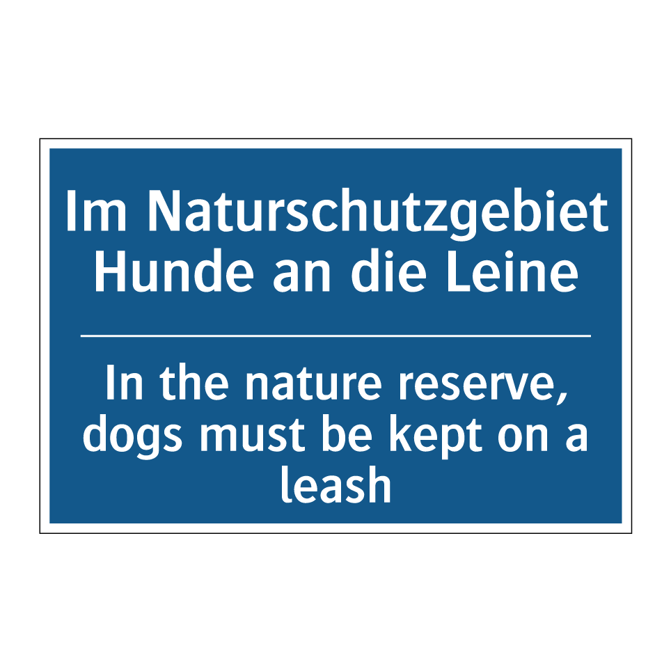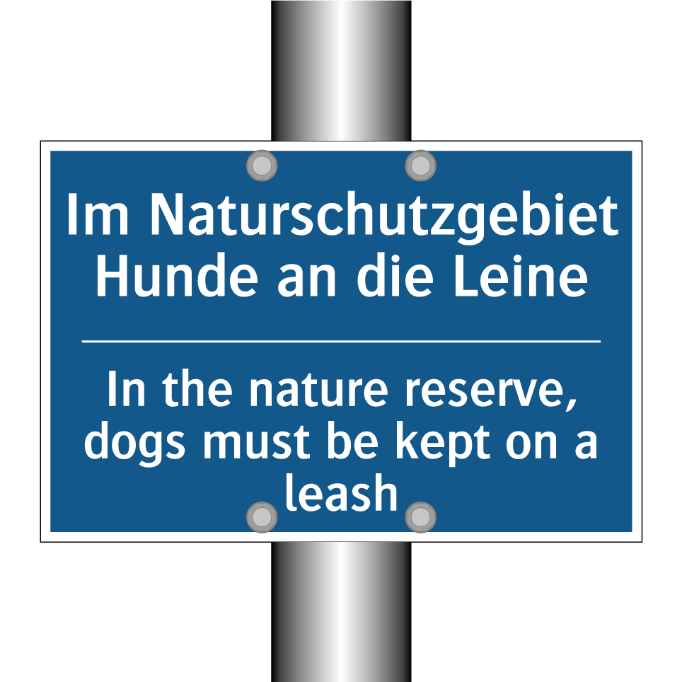 Zweisprachiges Verbotsschild mit deutschem Text Im Naturschutzgebiet Hunde an die Leine und englischem Text In the nature reserve, dogs must be kept on a leash