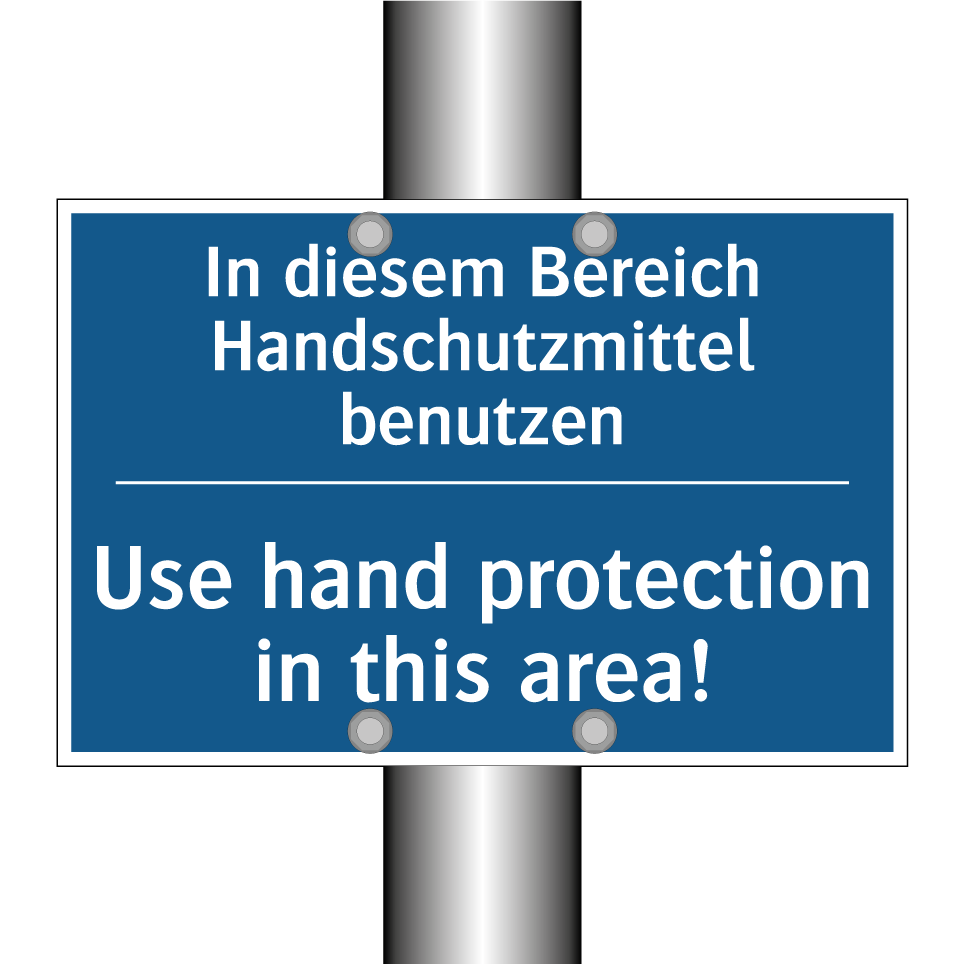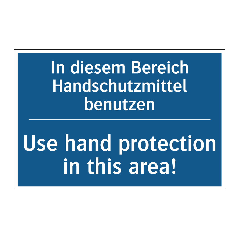 Zweisprachiges Verbotsschild mit deutschem Text In diesem Bereich Handschutzmittel benutzen und englischem Text Use hand protection in this area!