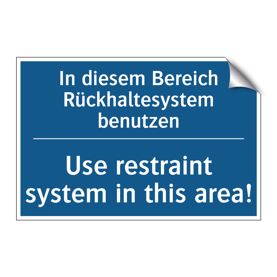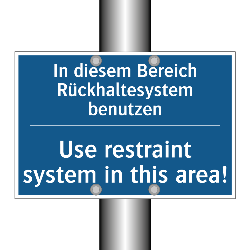 Zweisprachiges Verbotsschild mit deutschem Text In diesem Bereich Rückhaltesystem benutzen und englischem Text Use restraint system in this area!