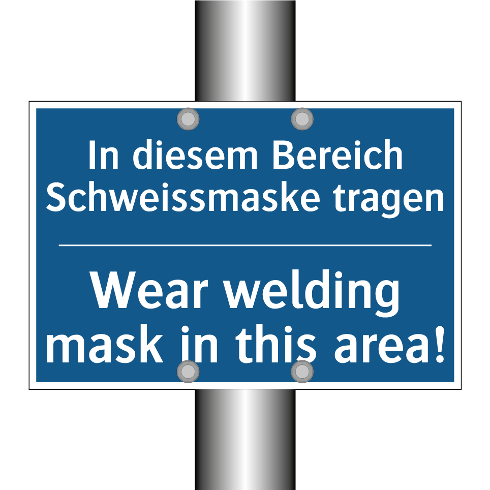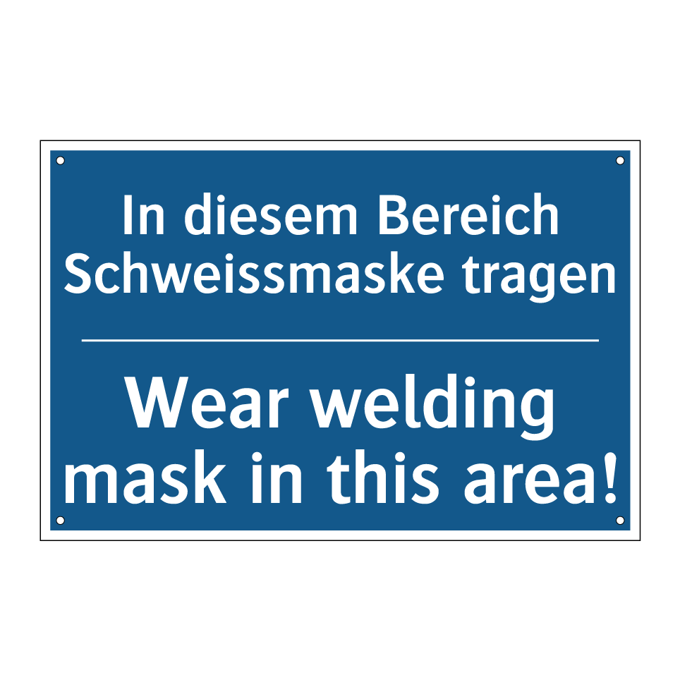 Zweisprachiges Verbotsschild mit deutschem Text In diesem Bereich Schweissmaske tragen und englischem Text Wear welding mask in this area!