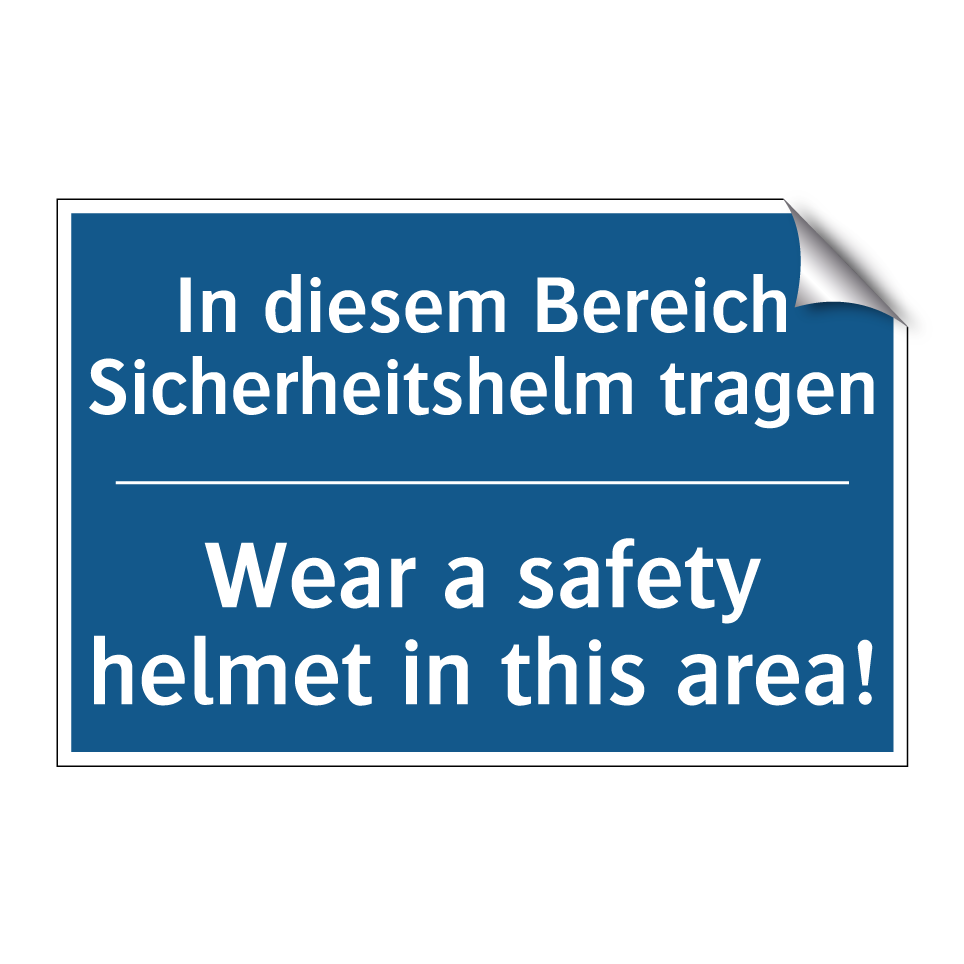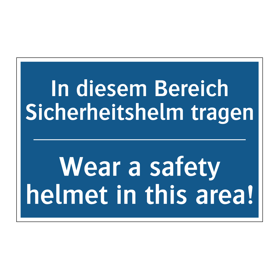 Zweisprachiges Verbotsschild mit deutschem Text In diesem Bereich Sicherheitshelm tragen und englischem Text Wear a safety helmet in this area!