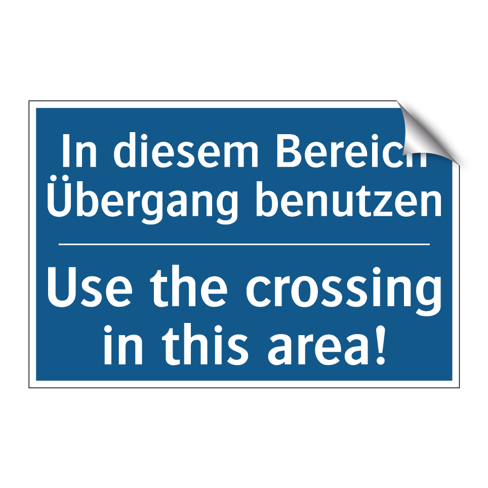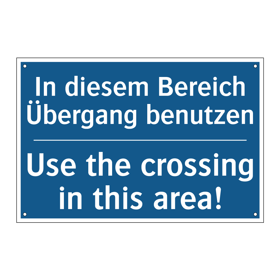Zweisprachiges Verbotsschild mit deutschem Text In diesem Bereich Übergang benutzen und englischem Text Use the crossing in this area!