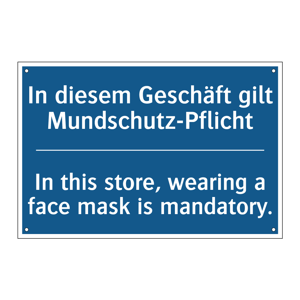 Zweisprachiges Verbotsschild mit deutschem Text In diesem Geschäft gilt Mundschutz-Pflicht und englischem Text In this store, wearing a face mask is mandatory.