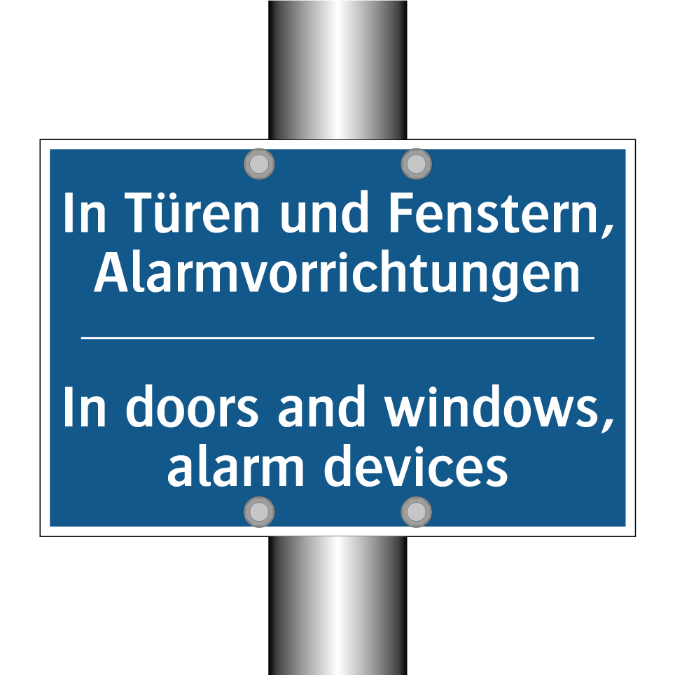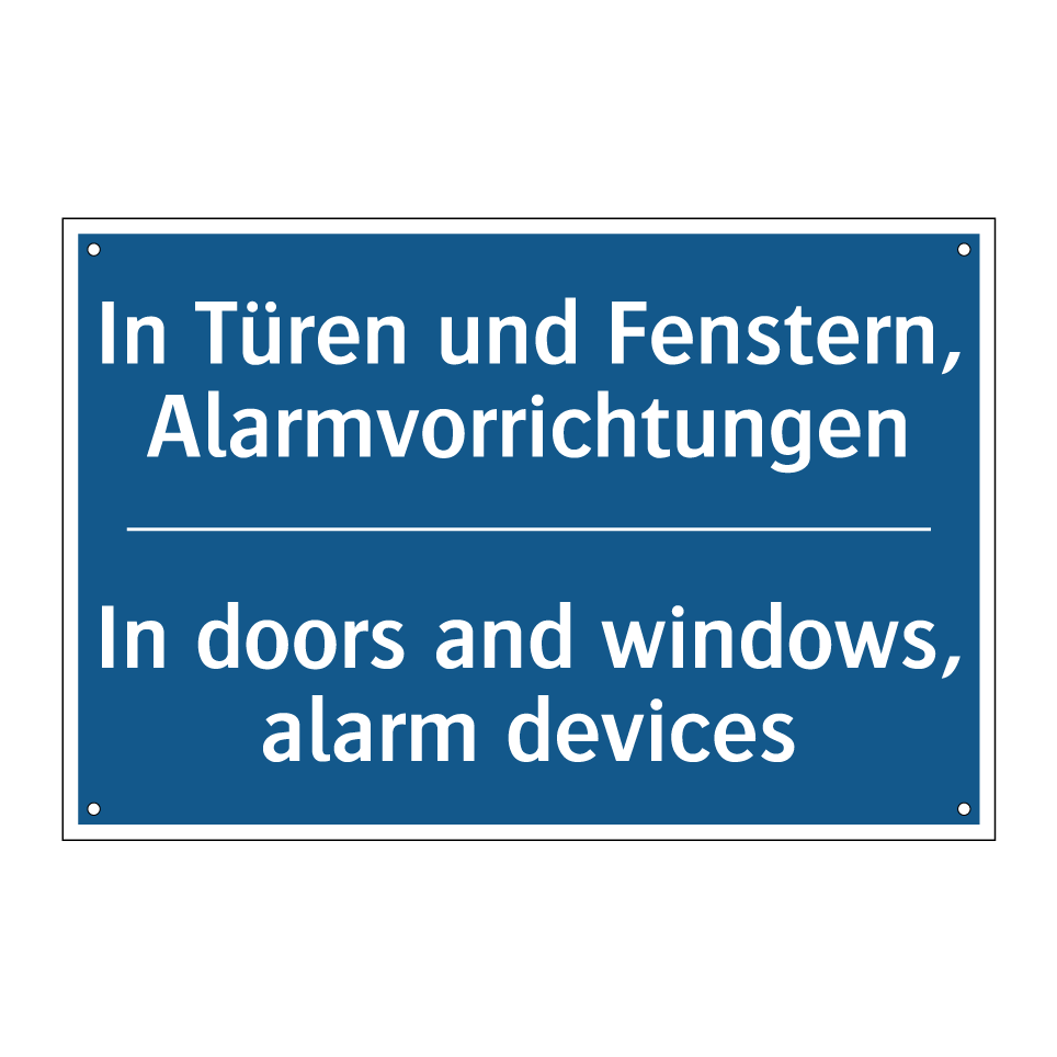 Zweisprachiges Verbotsschild mit deutschem Text In Türen und Fenstern, Alarmvorrichtungen und englischem Text In doors and windows, alarm devices