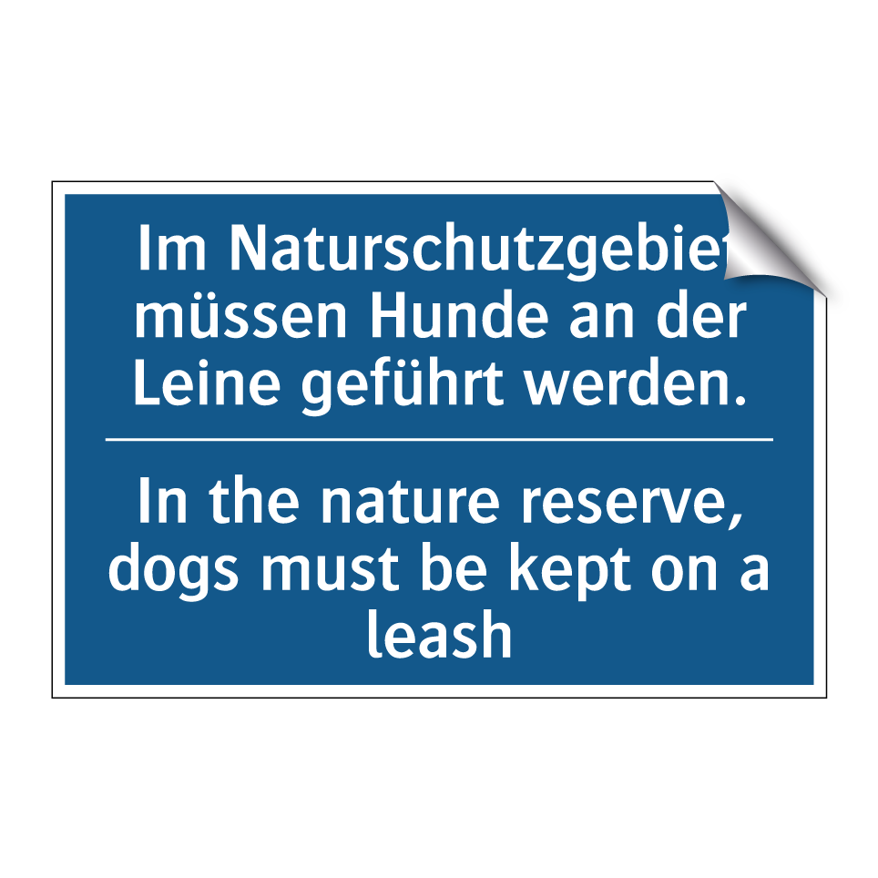Zweisprachiges Verbotsschild mit deutschem Text Im Naturschutzgebiet müssen Hunde an der Leine geführt werden. und englischem Text In the nature reserve, dogs must be kept on a leash