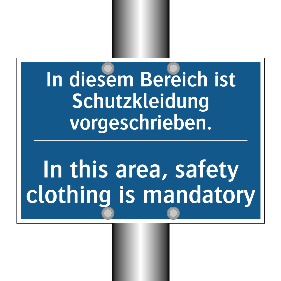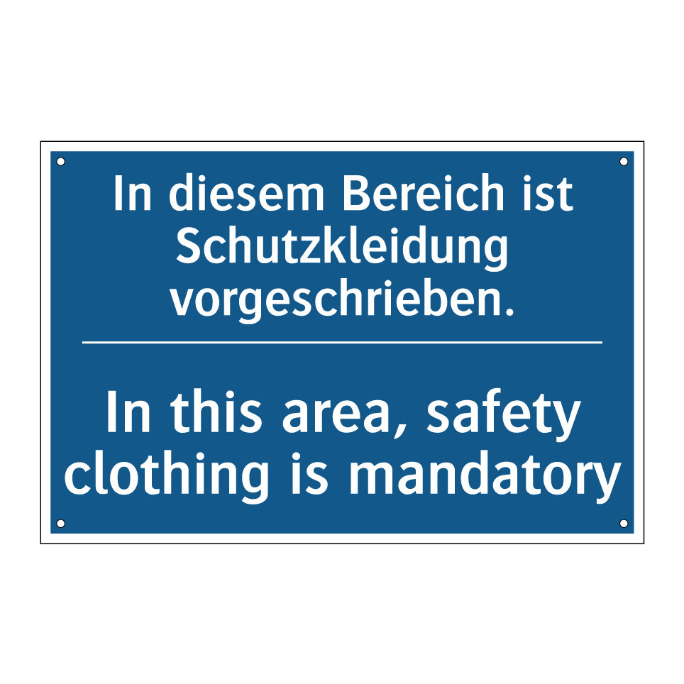 Zweisprachiges Verbotsschild mit deutschem Text In diesem Bereich ist Schutzkleidung vorgeschrieben. und englischem Text In this area, safety clothing is mandatory