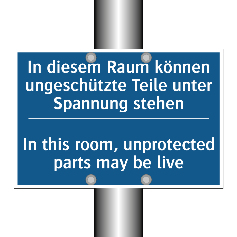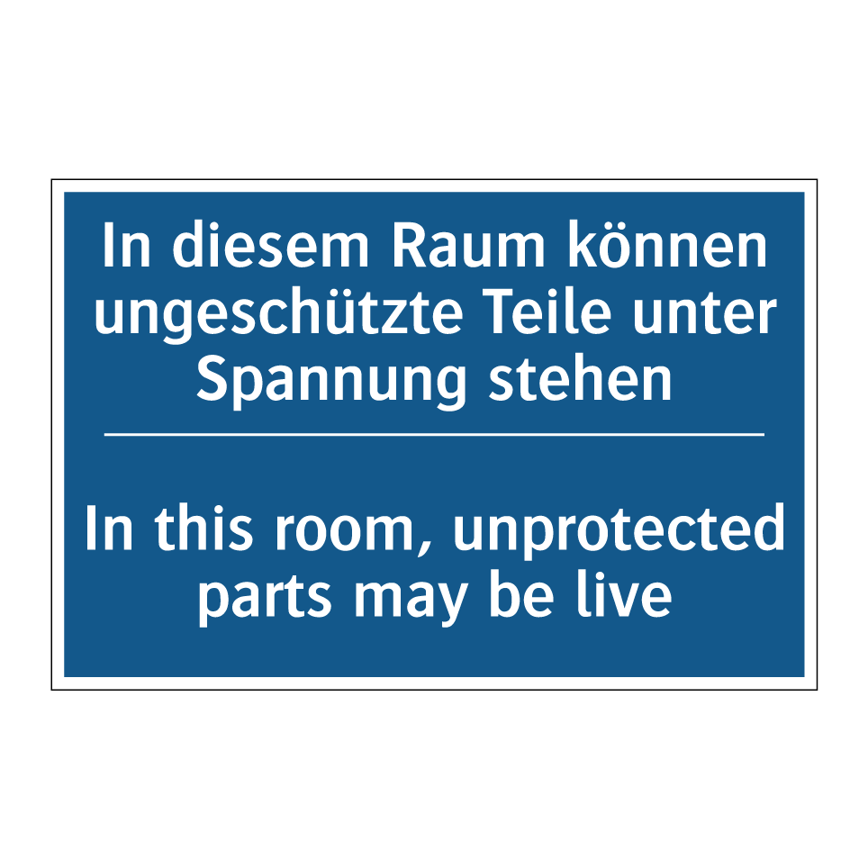 Zweisprachiges Verbotsschild mit deutschem Text In diesem Raum können ungeschützte Teile unter Spannung stehen und englischem Text In this room, unprotected parts may be live
